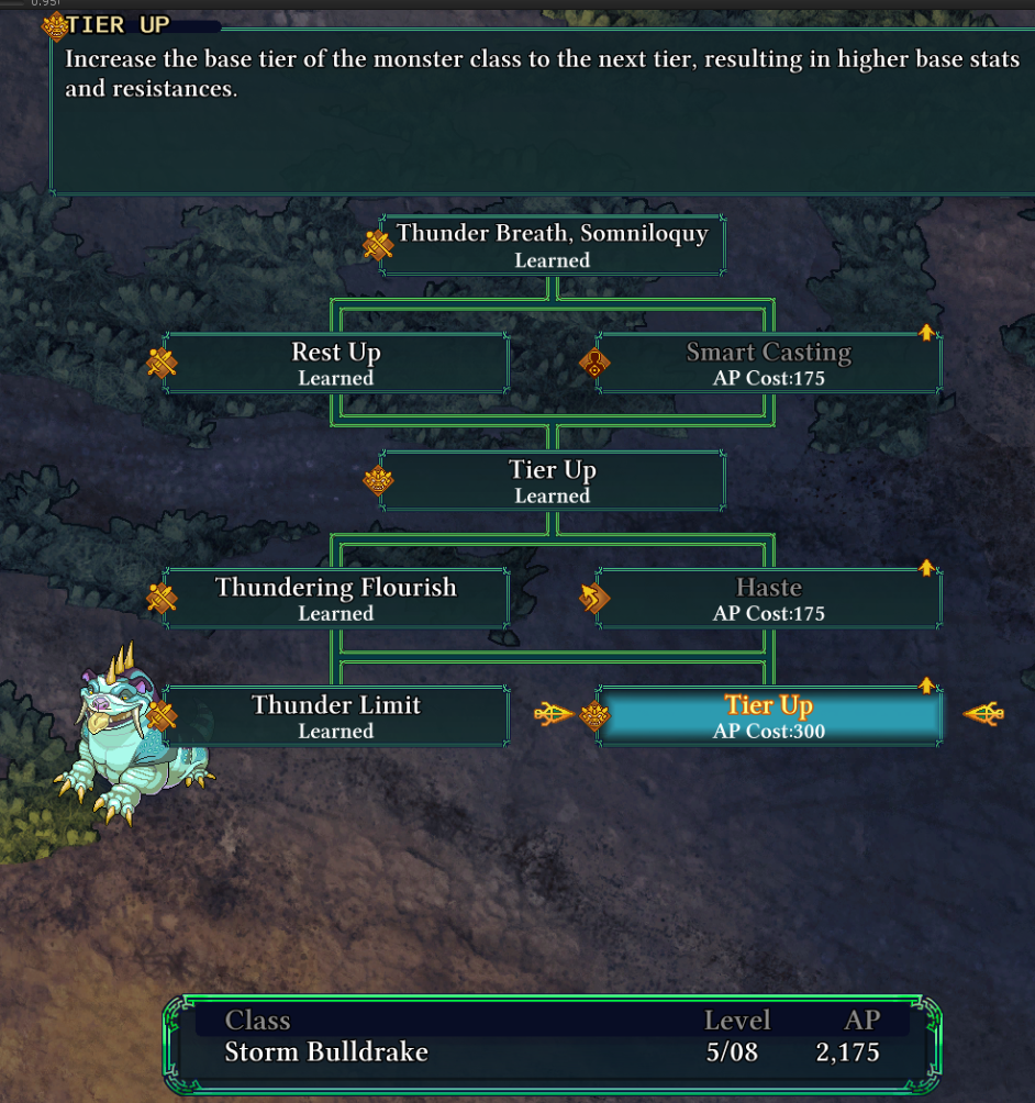 Monsters need to use AP to unlock abilities from their class and variants, just like humans. Since a monster's base class can't be changed ever, learning everything on it is somewhat quick, so we're keeping things simple and awarding AP to both their monster class and their primary variant at the same time. It's also worth noting that when taming a monster, they will come knowing all the skills they knew when you tamed them, meaning quite often their monster class will start almost maxed (or fully maxed if recruiting a Tier 3 monster), so the real use of AP lies in the Variants.