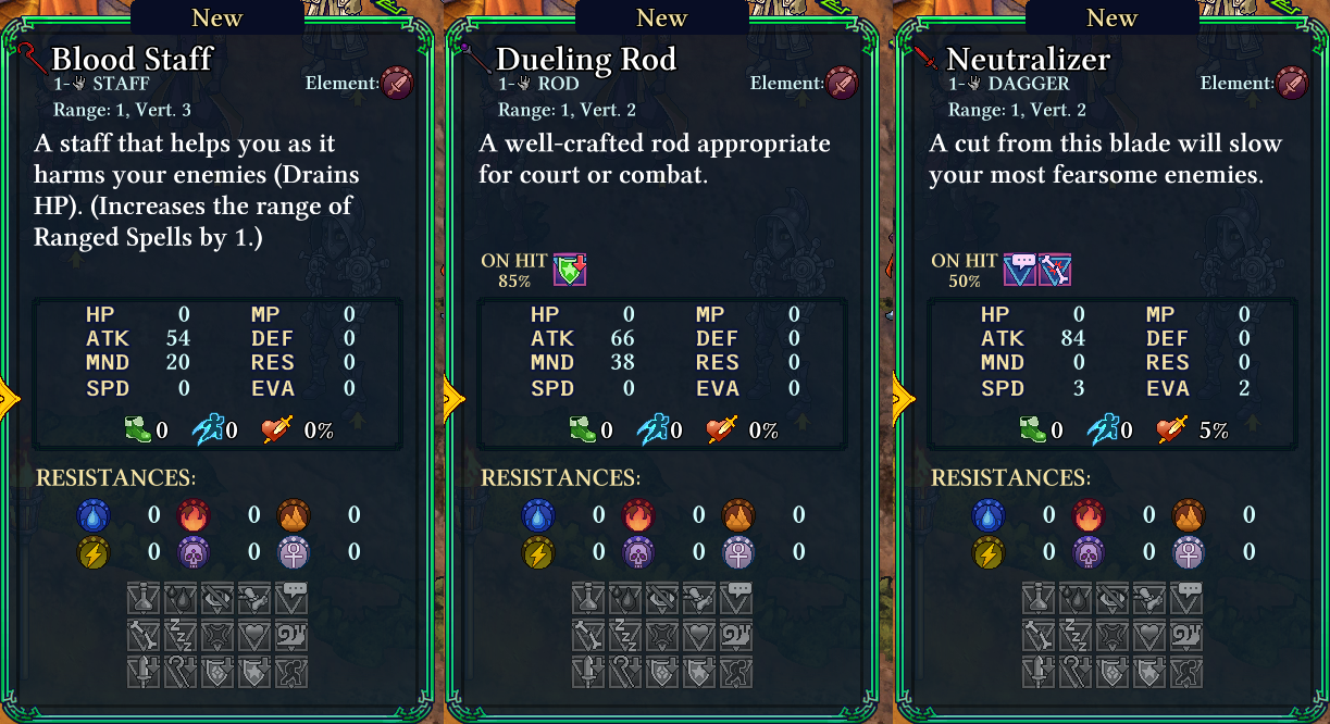 There were two main driving factors for the new equipment: adding new and unique gear and filling some more niche archetypes to give the adventurous player more options when crafting their dream team. Things like a shield with bonus atk or spell range, more elemental weapons options, cloth armor or deadly staves for the brawling healer, etc.