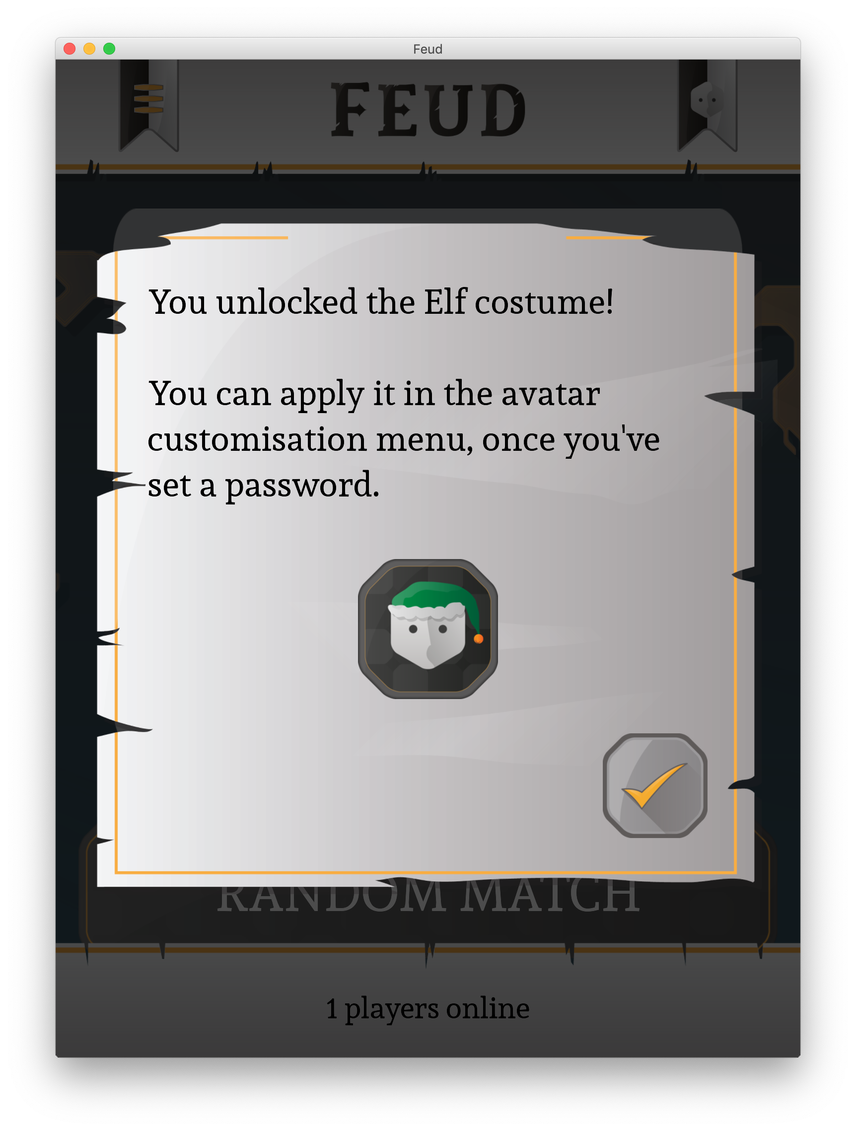 We've just released version 1.3 of Feud! This contains some nice quality-of-life features, as well as a big new feature in the form of customisable avatar costumes!