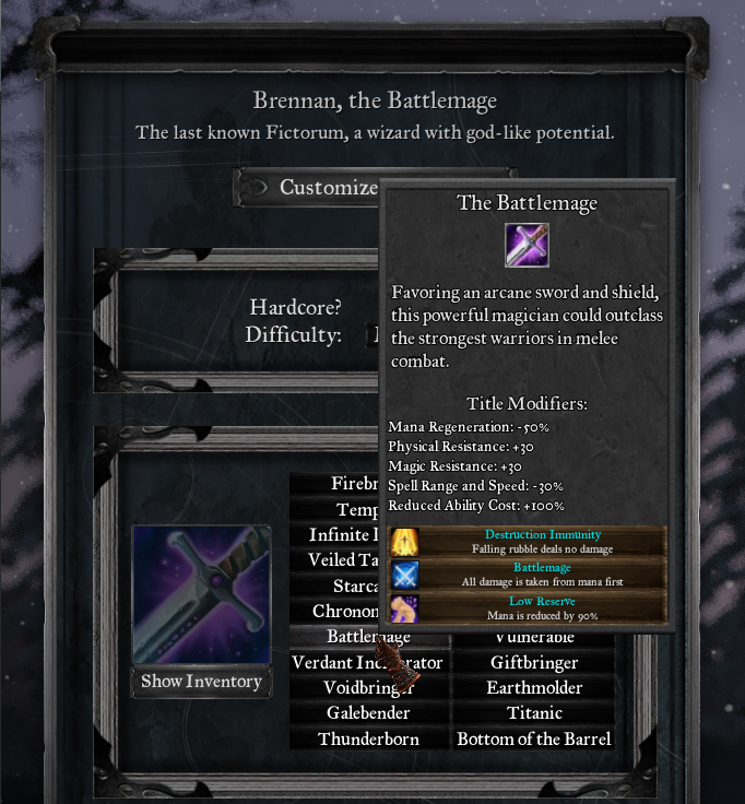 We felt that several of our previous starting titles were derivative, odd, or just didn't work. After plenty of internal and external discussion, many starting titles have been drastically changed! Titles will have permanent passives (some of which are drastic and unique to the title) and will now appear on a starting title tooltip. Additionally, certain starting titles will only have spells drop from their associated school. And lastly, many of the unlock conditions for starting titles have been changed to improve progression and title unlocks will be triggered from prior playthroughs on game load. These titles are very much still in-flux, so if you have any thoughts on them, please let us know—we would love to hear them!