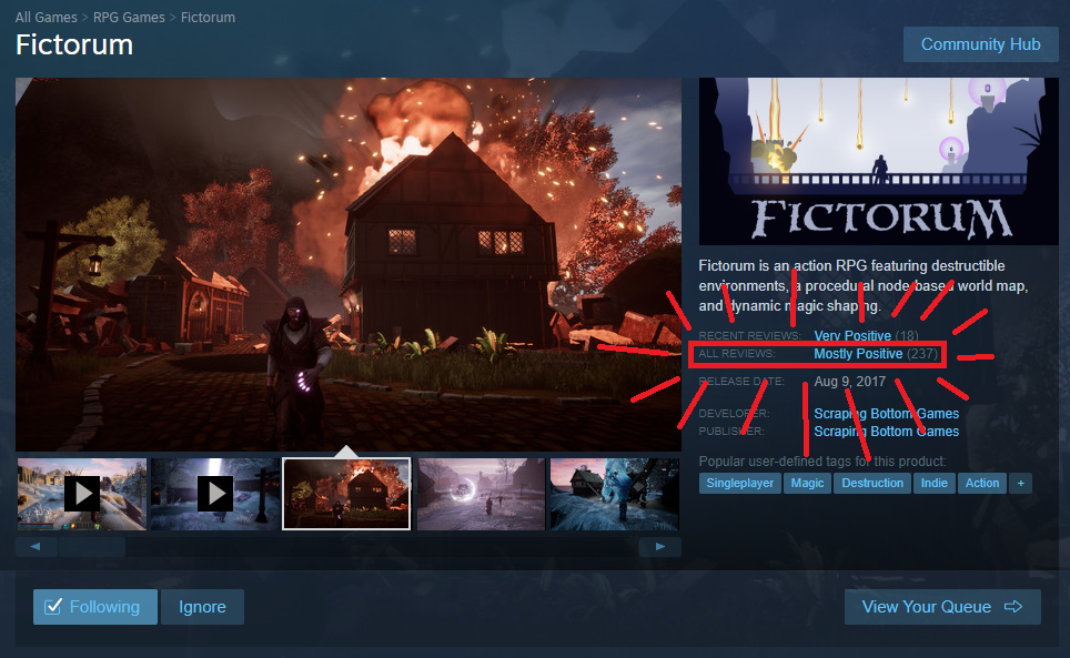 Thank you all for the reviews and feedback over the last year and a half—We're proud to have a Mostly Positive rating on Steam! We hope to make Fictorum even better in 2019.