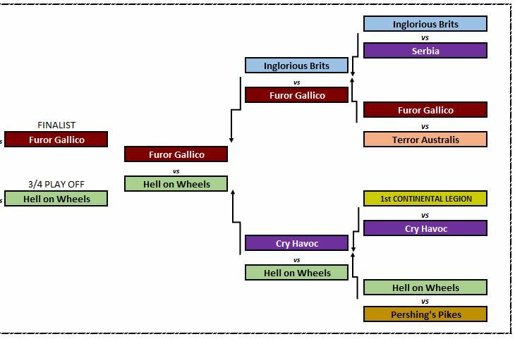 In the first phase of the KO phase, we will have some very interesting challenges. In particular the “Civil War” between the American teams “Hell on the Wheels” and “Pershing Pikes”. 3 Americans teams and 2 British teams are in the right-hand side of the KO table with Serbian, French and Aussie teams completing the line-up.