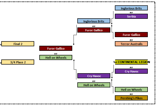The last match of the righthand part of the bracket was dramatic, with “Cry Havoc” facing off against “1st Continental Legion”! The result of this challenge was a near perfect draw, with the British prevailing with just 2% less casualties in 4 battles!