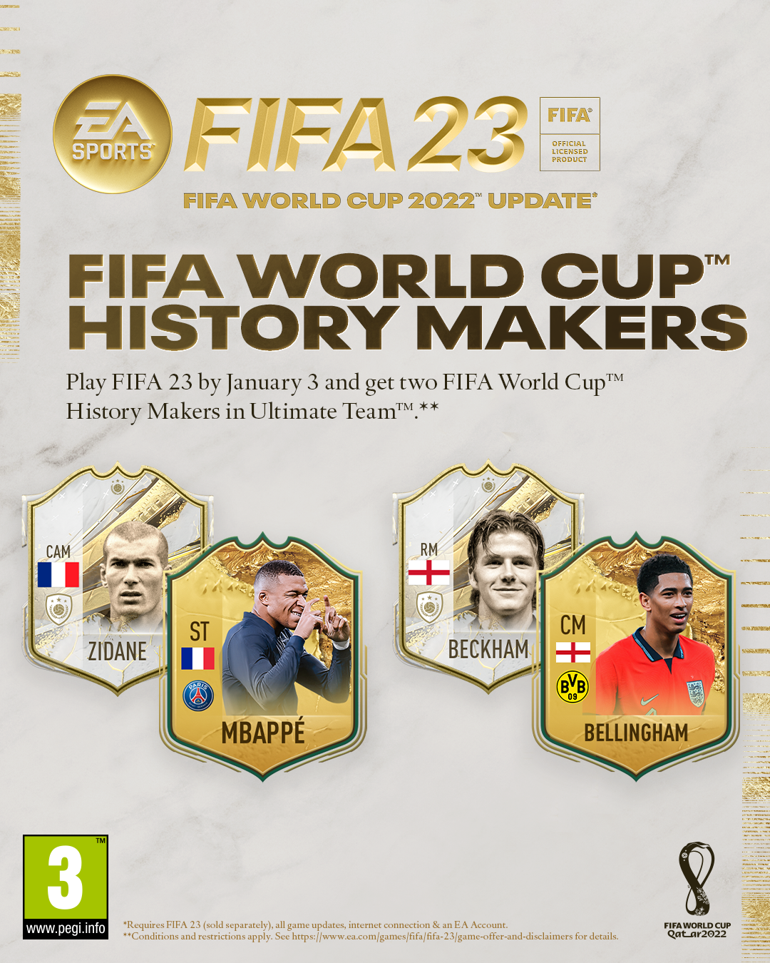 Pick up FIFA 23 Ultimate Edition for 60% less and play by January 3 to get a FIFA World Cup™ History Makers Item and a FIFA World Cup™ Team of the Tournament Loan Player Pick Item for seven matches in FIFA Ultimate Team™*.