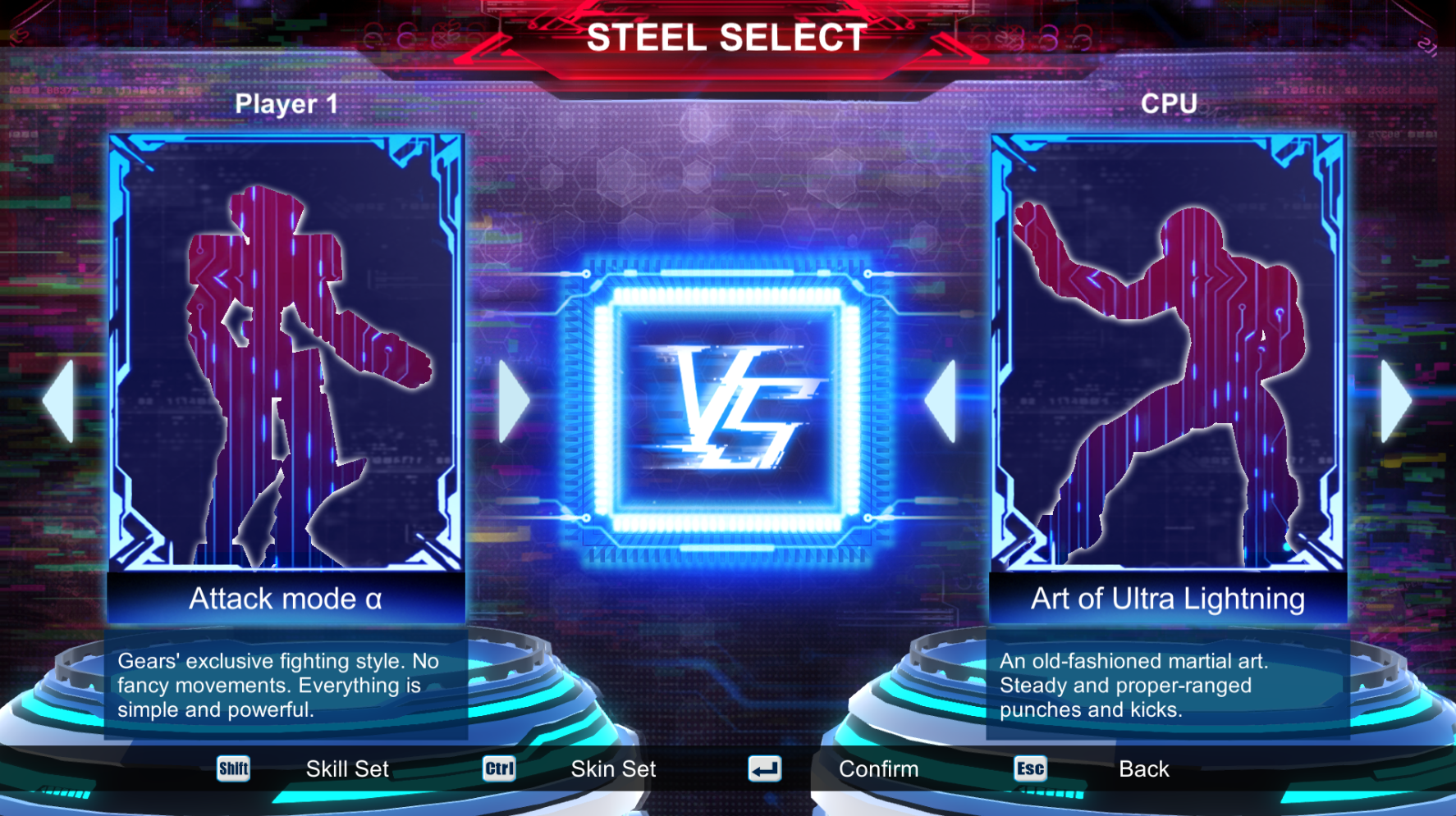 System Introduction ●Select a character ○Once players are in the STEEL SELECT menu, First, a player needs to select a Stance. A Stance includes basic punch, kick, movement, and normal throw skills of a character ○After selecting a Stance, players may swap 3 Skills and 1 Super Skill ○A player can also choose the preset Skins or Skill sets. A detailed description of settings is in the section Modes > Custom Steel