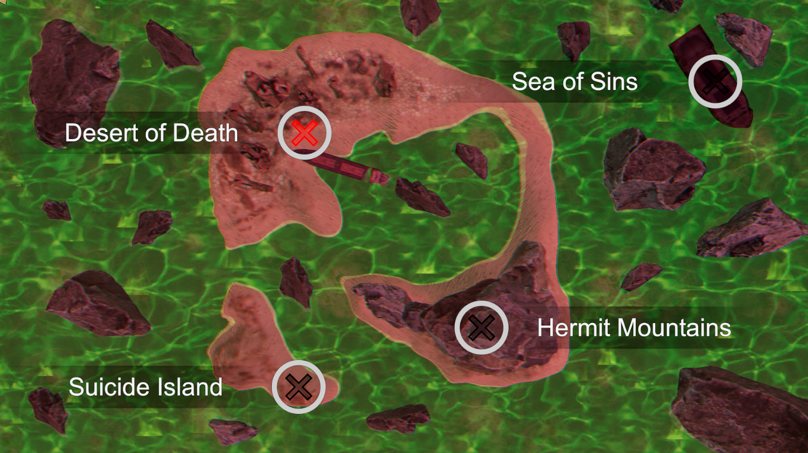On the global map, select the desired location from the list of available ones. (at the moment there are 2 locations available, the starting location "Desert of Death" and the new location "Suicide Island")