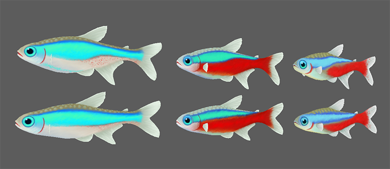 We already have a Cardinal Tetra species in the game but that needs to be improved. Fortunately the body shapes of cardinal and neon tetras are quite similar so we made a generic tetra model for both male and female that can be painted to look like different tetra fish species. Some other tetra fish, such as lemon and diamond tetras do not have such a similar shape and they will have different models.