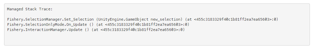 Here is the most important part of an error report. The stack trace. This tells us exactly where in the code the problem has occurred. Unfortunately there is a bug in the error reporting system itself. The 0 at the right end of every line should not be 0. They should be the line number in the code file at the exact point where the error occurs. This is a bug I cannot fix. It is up to the Unity people to get this to work properly. However we do know the exact function where the problem occurred and can therefore deduce what has gone wrong.