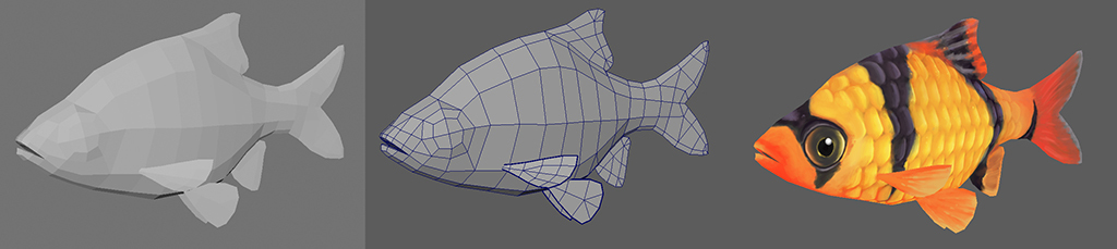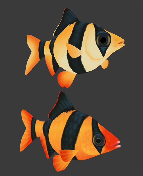 It also makes painting the fish easier because we paint on top of a surface that has more definition. This actually helps it feel more three dimensional. The old version tends to feel a bit flat because there is more detail painted into the texture but it sits on top of a simple featureless model. Essentially it comes down to us wanting to improve the quality. There is nothing particularly wrong with the old versions but they can be better and it is important to make them the best that they can be.
