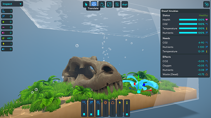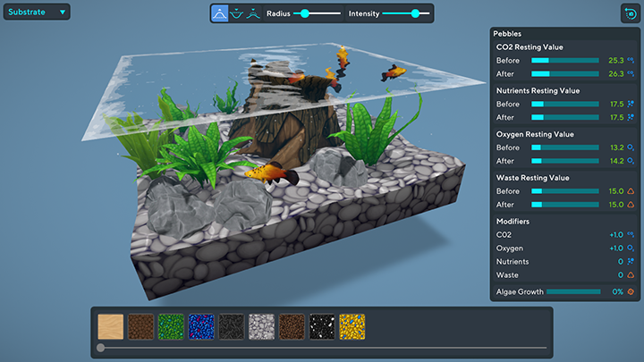 Each substrate now has the capability to modify the water chemistry. For instance some substrates that contain earth/soil increase the nutrients in the water while other substrates made of rocks and other minerals increase CO2 and oxygen. This means that the reason for choosing which substrate to have will not be based solely on appearance. Another way of thinking about it is that we are attempting to add the butterfly effect into the game in an indirect way. Every change the player makes to their aquarium by adding or removing something will affect the simulation. The full consequences of these actions will make themselves known later. That does not mean that every outcome will be sinister in nature. We want to allow to very cool positive things to happen and be made possible. A lot of the numbers that govern this are not final to keep in mind that an item's inputs and outputs are far from final as we test and test what works well.