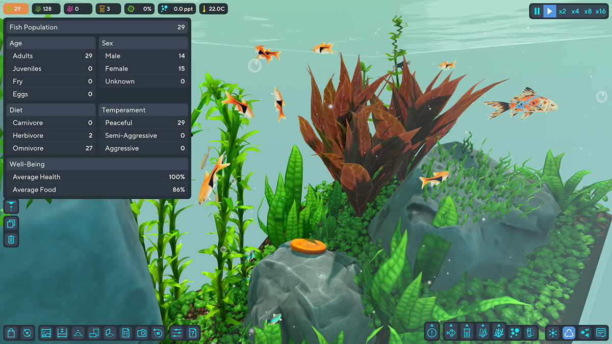 The population UI for fish has been changed to show more than just how many fish are in your aquarium. Now you can see an overall idea of how healthy and hungry they are as well as their dietary requirements, genders and temperaments. It saves a lot of time clicking around on all the fish to get the same picture of how you need to care for your fish etc.