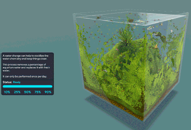 This feature will certainly help players keep their aquariums a lot cleaner and the water chemistry a bit more stable. In the example gif a 75% water change is being performed. 75% of the water is removed and replaced with an equal volume of clean water. This removes approximately the same volume of water chemistry contents. You can see there is a large reduction in algae and waste but co2, oxygen, nutrients and temperature are also reduced by this process.