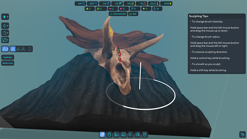 After de-clunking how players can create and place objects into their aquariums last week the next mostly clunky tool was the substrate sculpting tool. It has been moved from the substrate mode and can now be activated from the normal manipulation menu on the left of the screen.