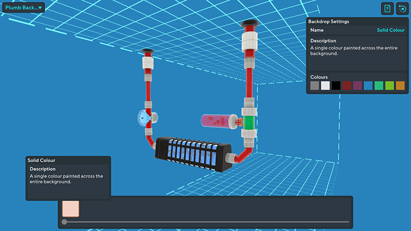 The only backdrop available for the plumbing area for the moment is solid colour. It will not share all the same backdrops as the aquarium itself. This is because there is meant to be a distinction between the plumbing area and the aquarium. The aquarium represents creativity, a sort of colloquial definition of chaos theory and butterfly effect, ecosystems etc. Whereas the plumbing area represents artificial life support, rigid parameters, machinery, limited choices etc. This distinction should be present is the type of backdrops available so things are thematically consistent.