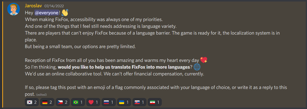 When making FixFox, accessibility was always one of my priorities. And one of the things that I feel still needs addressing is language variety. There are players that can't enjoy FixFox because of a language barrier. The game is ready for it, the localization system is in place. But being a small team, our options are pretty limited.