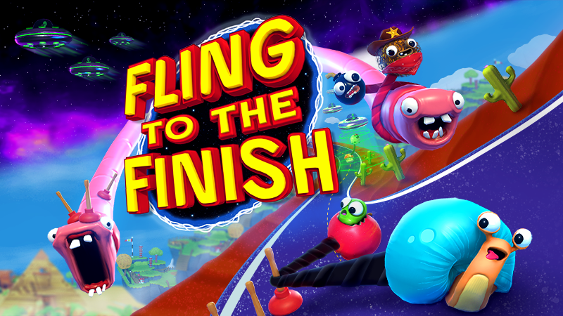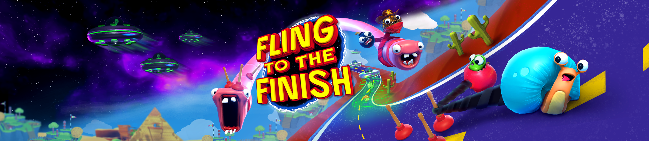 Fling to the Finish is a cute and wacky co-op racing game where teammates twist and turn their way through tricky obstacle courses, all while tethered together by a stretchy elastic rope. Dodge surprise enemy attacks, and try to reach the finish line without getting too tangled!