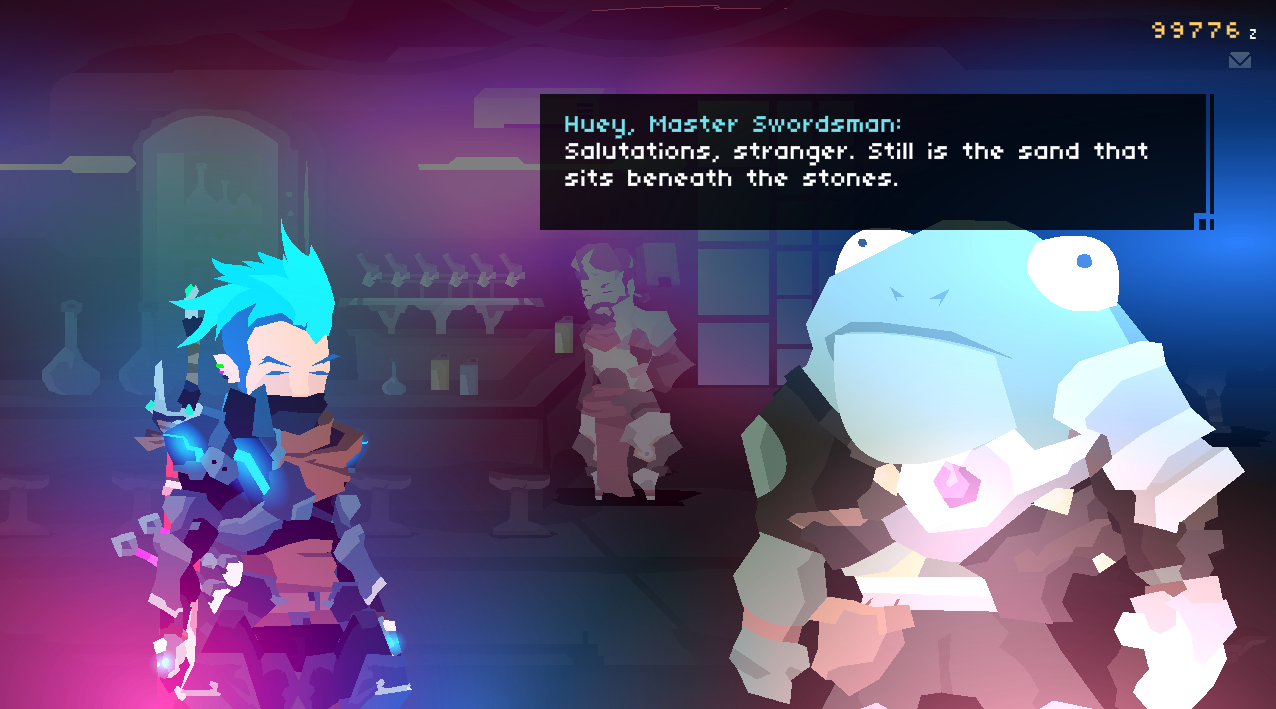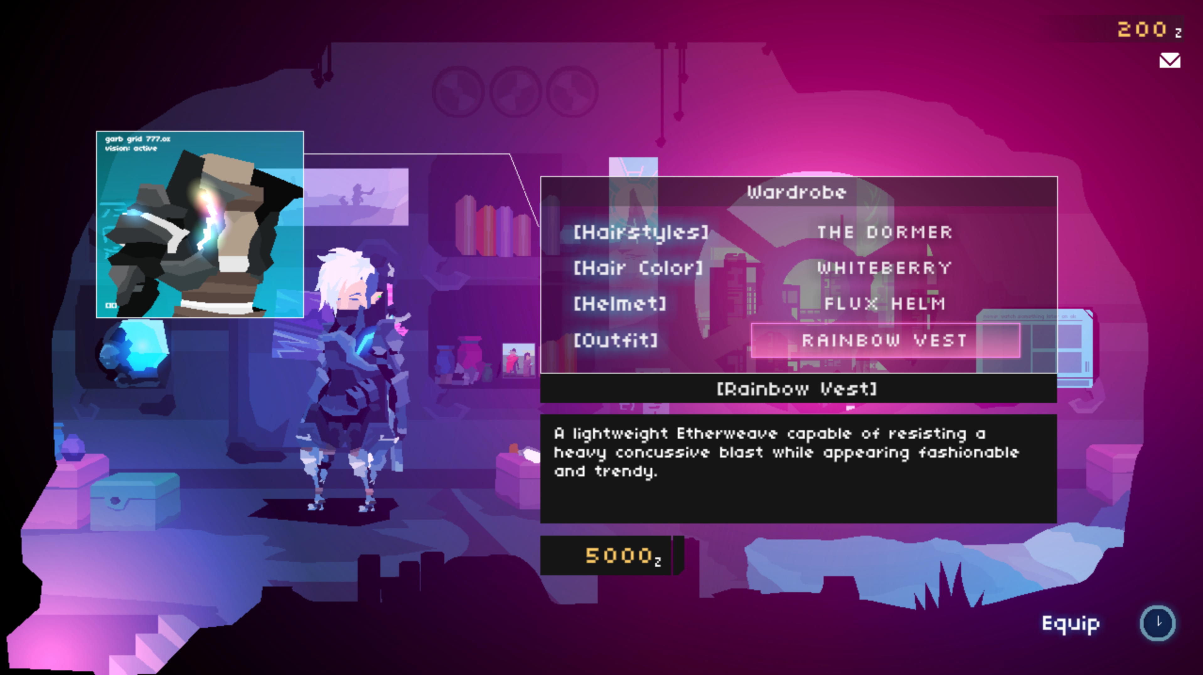 For a full breakdown of the included changes, see below: - A new series of dialogue is available via the drunk ambassador in the Glam Glam Bar (Keep your eyes peeled along the coast to the south of your apartment) - Increased the speed of dagger attacks slightly - Updated text for area transitions to say "head to/go to" instead of just providing the name of the area you'll go to for consistency/clarity - Fixed a save game load issue that wouldn't properly set your cosmetics and cause an odd graphical roulette (if you experienced this, reassigning your cosmetics fixes the issue) - Fixed a layering issue with the "reeling" player fishing animation - Added some windows to background walls - You can now change your hair color at the Wardrobe closet - Revamped the Wardrobe UI to accommodate other changes - Added the Rainbow Vest outfit - Added the Sellsword Crest Helm - Fixed an issue that would cause the Wardrobe UI to open and then gradually fade - Fixed an issue with a shadow popping over Wanderer's legs in Stonewall - Added Brightpulse and Highleap attacks (replacing previous upgrades for charge speed and such) - Brightpulse releases a blinding light, stunning all enemies in front of you - Highleap is an evasive jump into the air, followed by a falling thrust attack that hits all surrounding enemies~ - Adjusted movement during attacks so all default combos are static and heavy attacks (now called Shieldbreakers) have more mobility - Adjusted Dash speeds in some areas that were a little slow (dashing should be more even regardless of an area's scale) - Adjusted Groove Mode's controls description to better reflect that mode's commands - Adjusted Assault Mode's controls description to better reflect that mode's commands - Removed Blocking and Countering (had some errors, odd behaviors, made a design choice to shift away from this) - Tweaked numerous animations - Adjusted enemy shadow colors - Improved legibility of workshop/augment UI descriptive text - Fixed some typos!