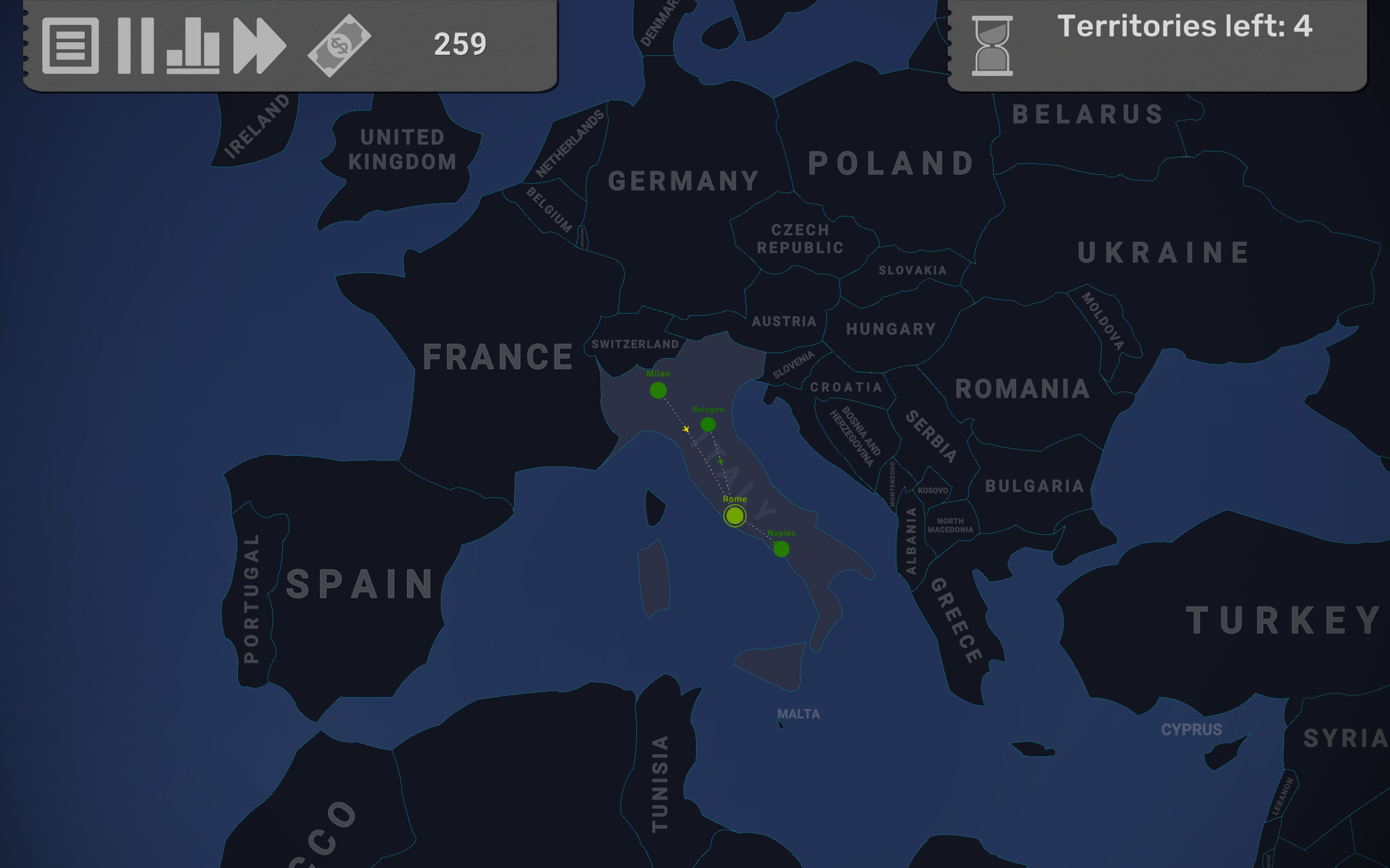 - Fixed the bug when upgrading an airport from the statistics screen gave twice as few infrastructure points as upgrading it from the map. - Arrows pointing at overcrowded cities (with camera panning to overcrowded cities disabled) have been removed from the Game Over screen. - Fixed the logic of random events in scenarios. Now, if the "Random event trigger interval" is zero, the "First random event time" and "Time before showing message with the consequence of the choice taken in event" parameters are not active and greyed out. - Fixed the timer for events that have a lifespan. Now it indicates the correct time until the next event appears, even if it is called not by the interval, but earlier, by the timeline in the scenario editor - Fixed the bug that caused the pop-up of a city or route to close when a new territory is unlocked - Fixed the assignment of target territories in the "Discover the World" mode. Now territories bordering through the Pacific Ocean will not be considered as neighbors.