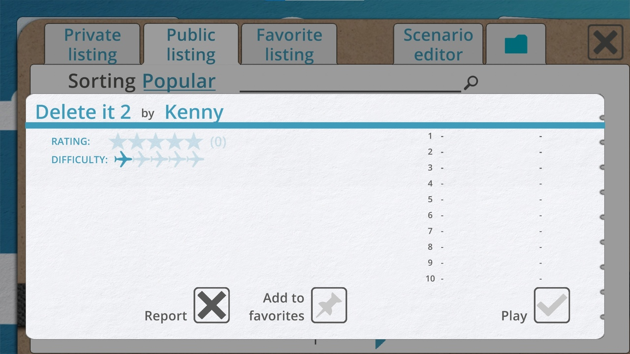 There won't be unbeatable scenarios - author has to complete the scenario before uploading it. We're starting the test in a closed Steam branch. To switch to this branch, right-click Fly Corp in your Steam library and click "Properties". There, go to Betas tab and enter the code "flycorppublictest". After that, switch to "public_test_ branch. Don't forget to switch back to the default branch after you finish taking a look at the test branch. If you don't, you won't be receiving updates for the game in the future.