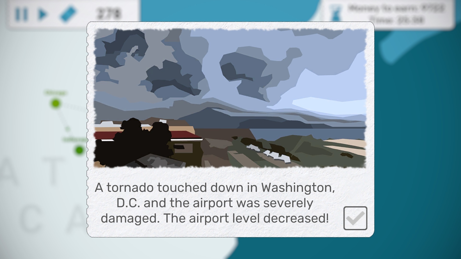 So, here's what we fixed in today's update: - Fixed a bug which caused level 2 planes and airports to remain at level 2 after restart (if random event about upgraded planes or airport was triggered); - Fixed bug with removing routes to or from blocked city; - Fixed bug when money wasn't added to your balance after the event in which you get money and 3 cities are unlocked instantly; - Fixed translations of reduced passenger flow event. Fixed logics of "Yes/No" choice in this event; - Fixed font size of newly unlocked cities; - Other minor fixes.