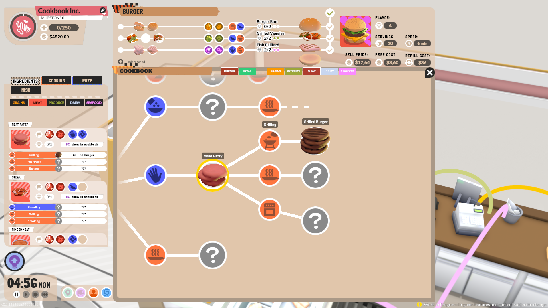 Every ingredient that you look up in the cookbook will highlight all the processes it can go through as well as the processes that preceded its creation (if those exist!). In the case of Meat Patty, you can quickly see that this particular ingredient can go through several different processes (including highlighted Grilling), and that it was created through Hand Prep from a different ingredient.