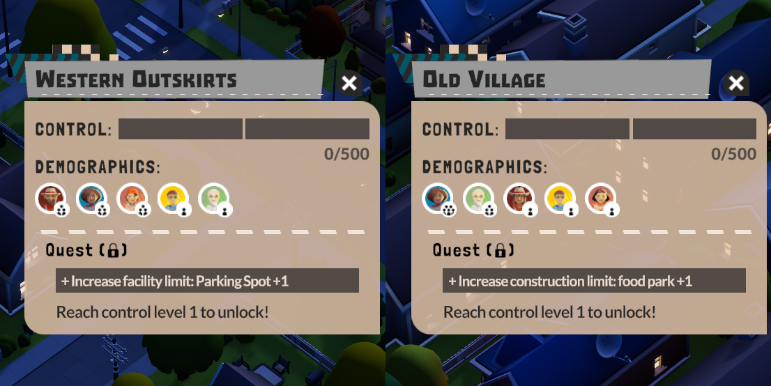 Name: Every neighborhood needs a name, right? Speaking of which - Join our Discord if you want to name some of the areas yourself as weβre currently gathering all ideas for their names! Control Progress Bar: Showcasing the current level of your control over this place. Demographics: A summary highlighting all customer demographics and how big is their population in this area. Quests: Some neighborhoods will have unique quests tied to them - with an enticing reward!