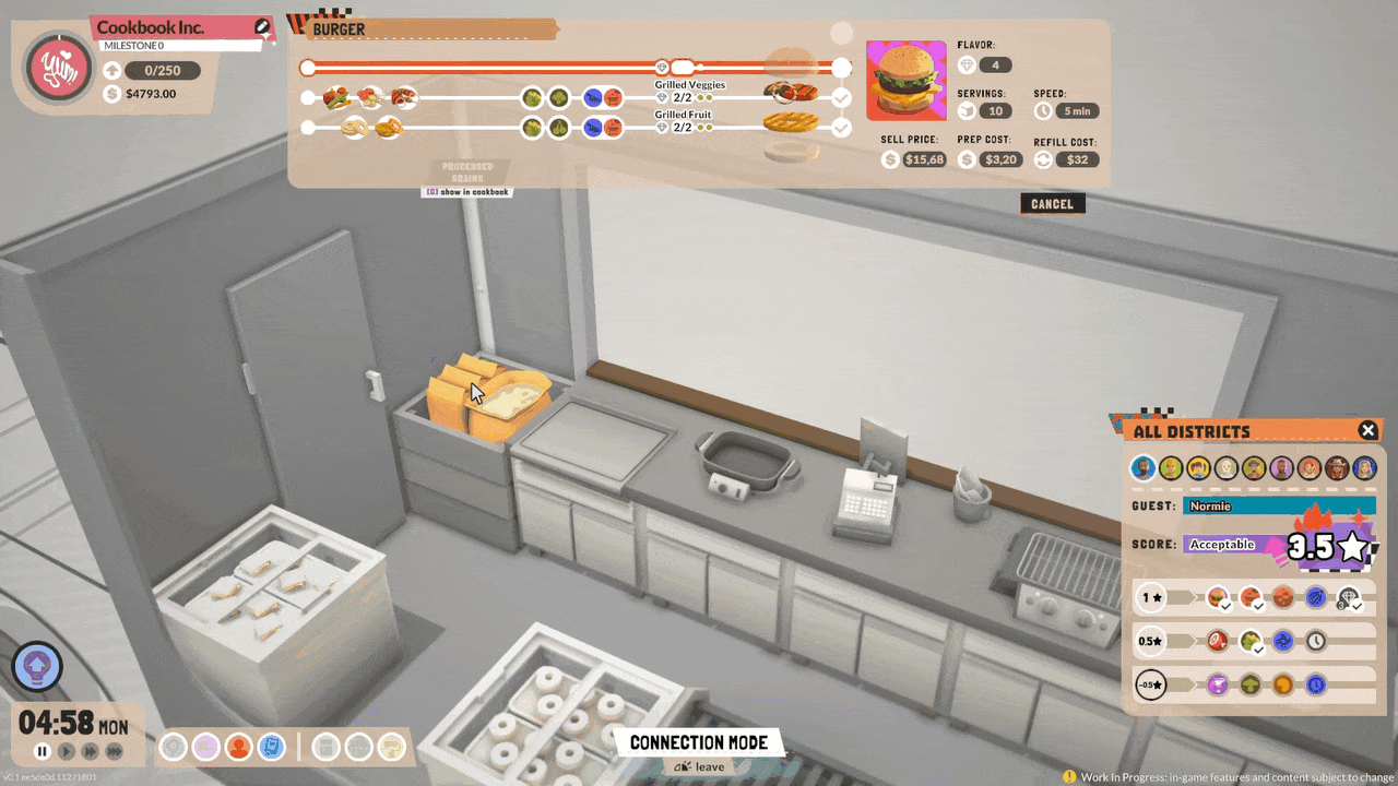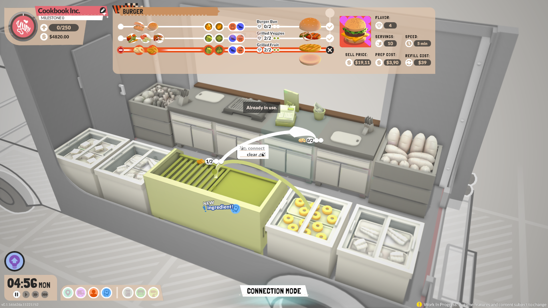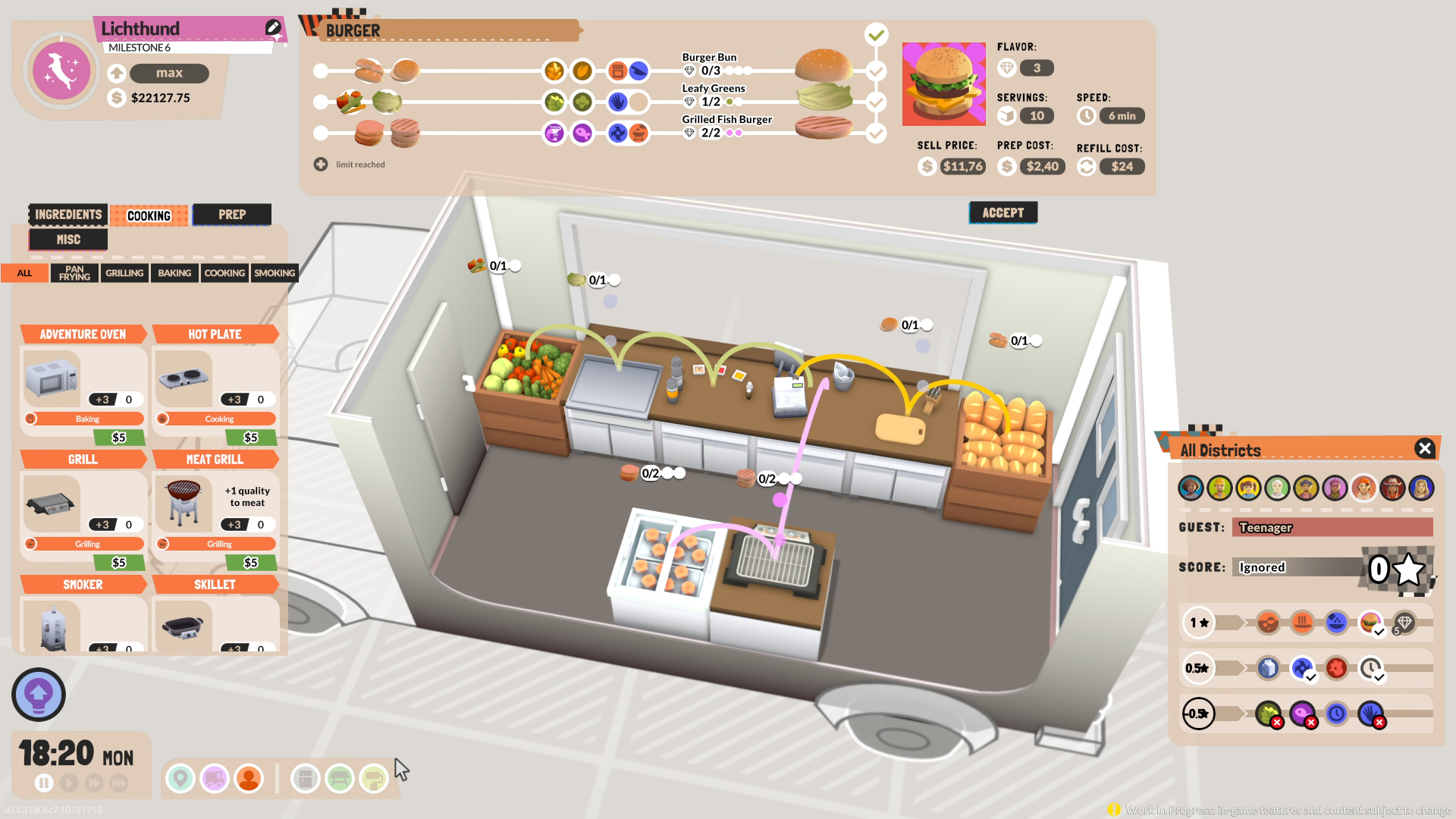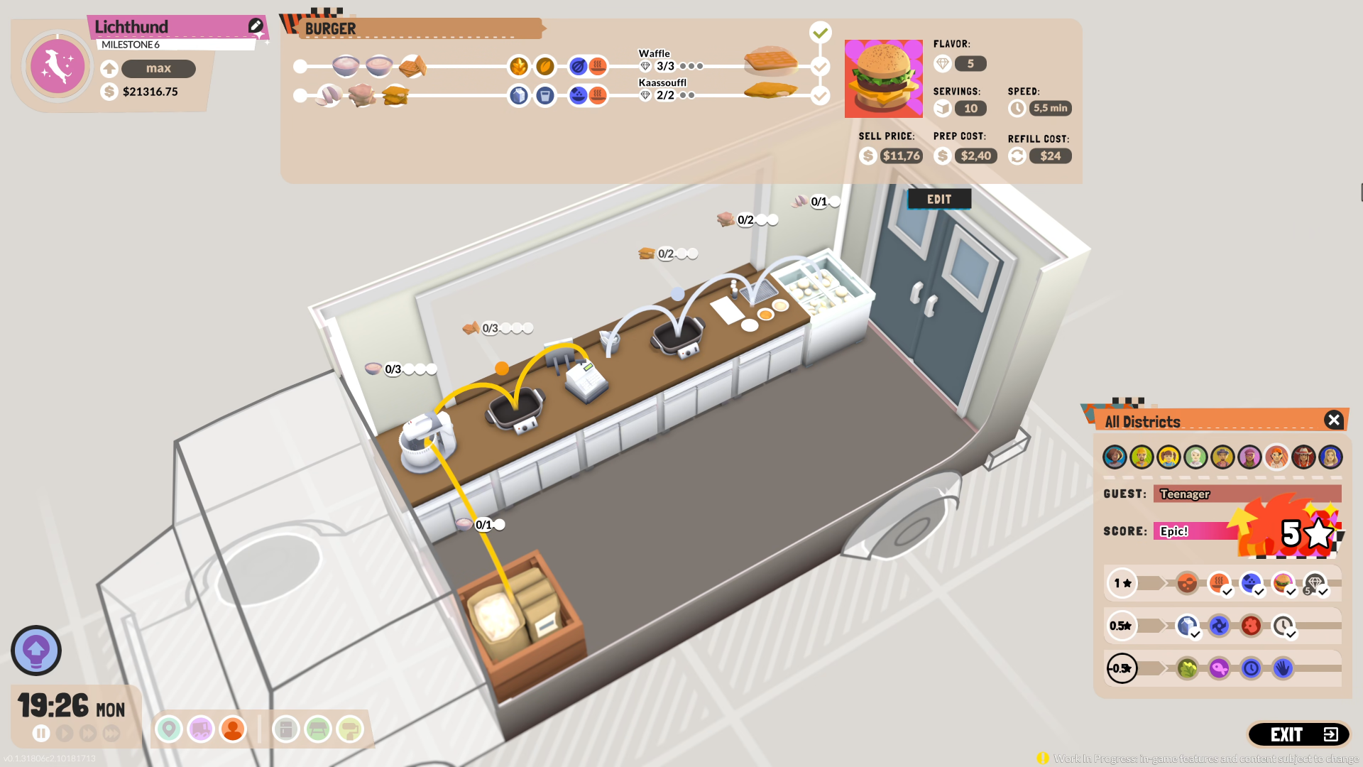 You have limited space in your food truck and you need to organize it properly. You can drop and move the elements of your inventory wherever you want in the food truck (but the serving counter needs to be by the serving window!) to organize your pipeline however you see fit. Sometimes you will have to sacrifice some speed to make sure you have more flavor. Sometimes you will do the exact opposite to appease the customers with a short fuse. It's up to you to find the best possible connections!