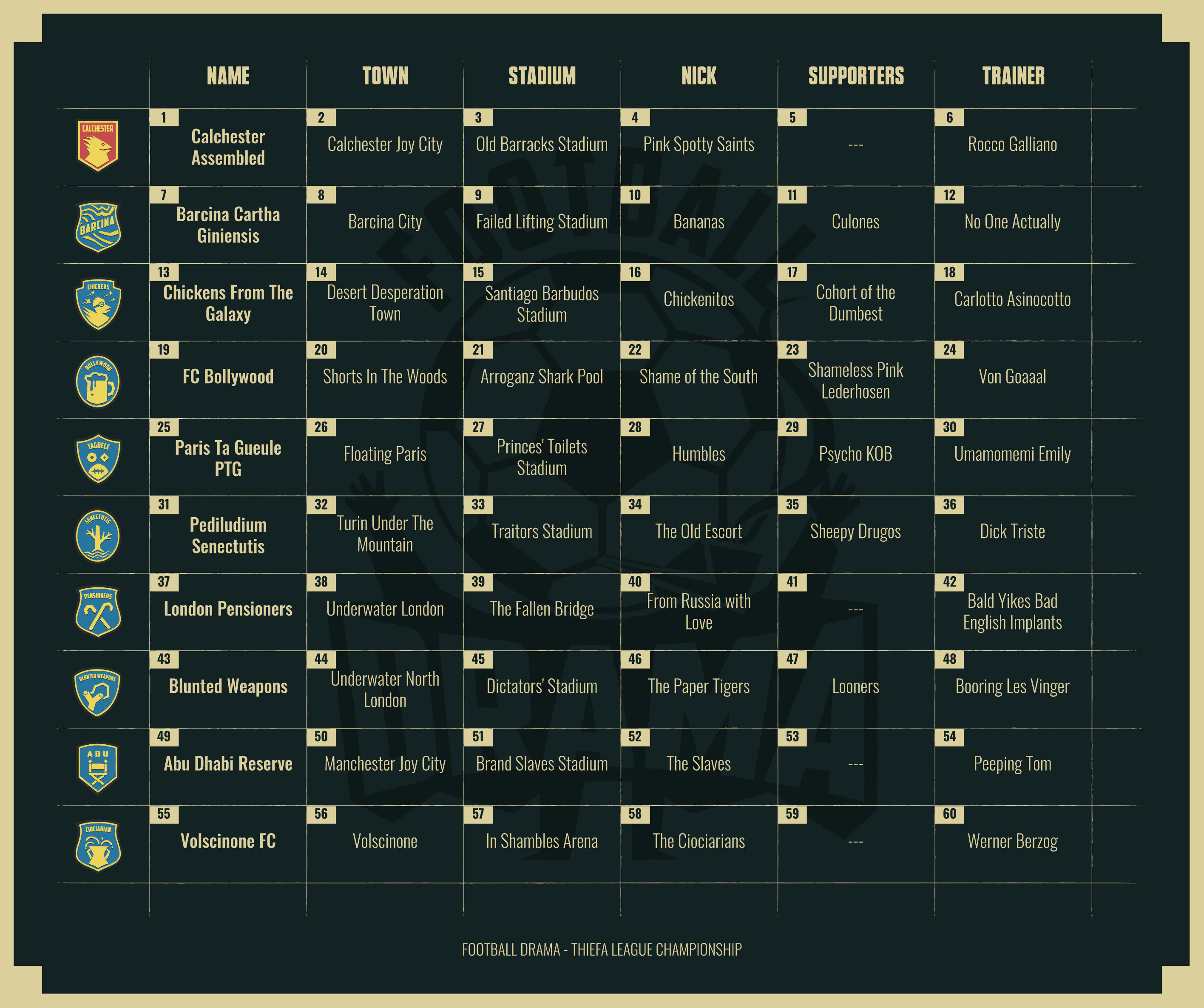 These are the teams, managers, supporters and towns you find in Football Drama. Now, none of these officially refers to anything real. But to your overexcited mind, what teams, managers stadiums and supporters are we mocking?