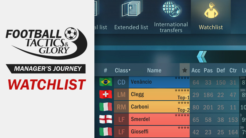 Watchlist. Forget the pen and paper! You can now add up to 20 footballers to the watchlist. The size of the watchlist is not connected to the level of the coach. This feature is fully available from the start of the game.