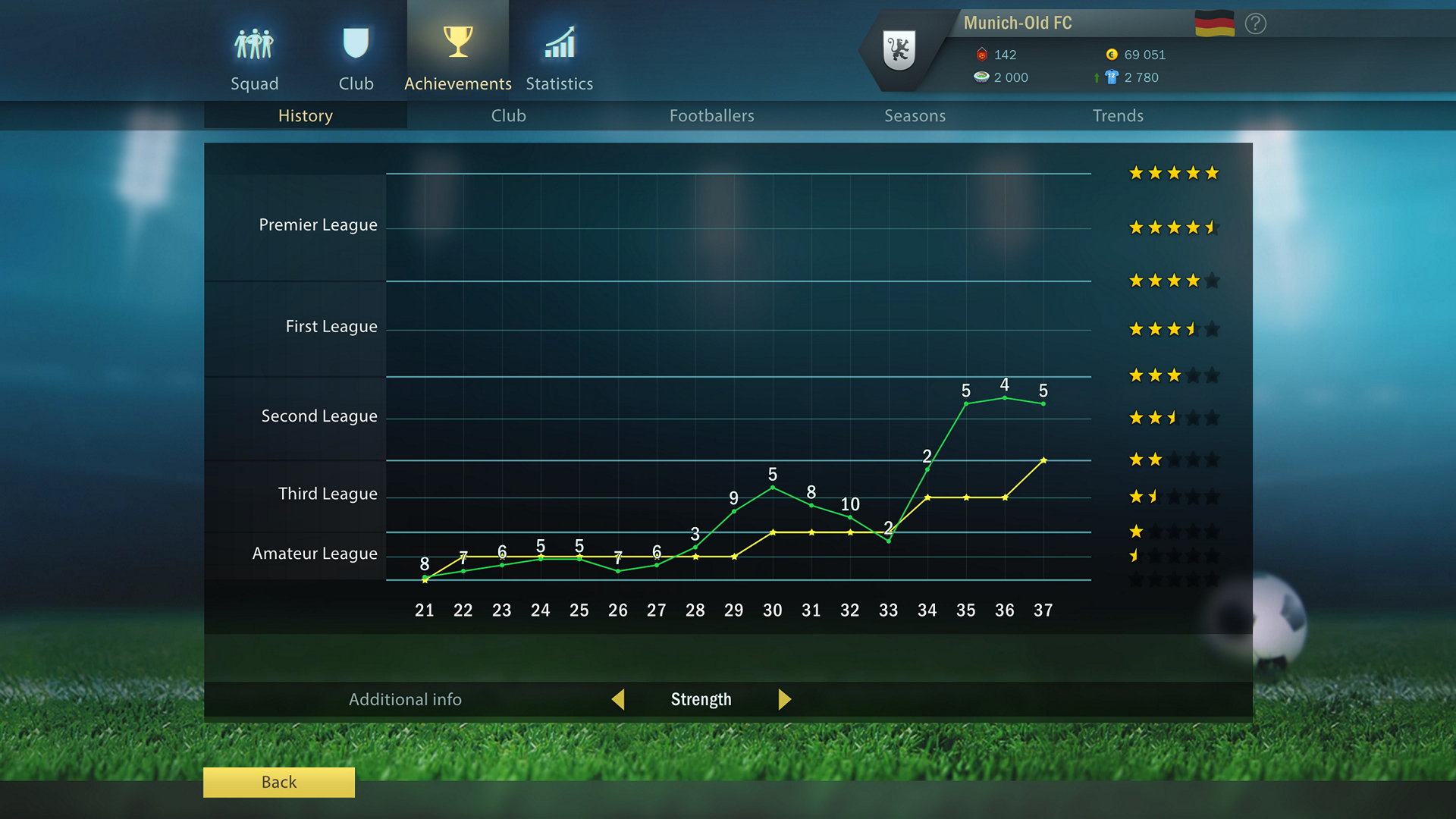 The hardest part in this mode is to move from the Amateur to the Third league. Some players have reported that they did it just for 3 seasons. But for most players, this is an almost unattainable result. My personal best is going up in five seasons. But when I first tested Hard Mode balance, it took me 8 seasons to advance to Third league:
