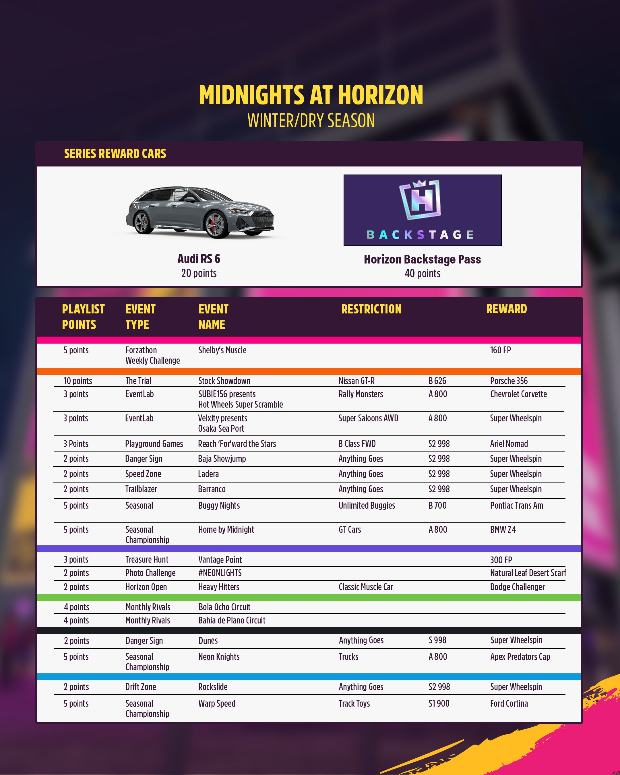 [p]The final week of Midnights at Horizon features the successor to the beloved Cadillac ATS-V. With a rear-wheel drive platform and a 3.6-liter twin turbocharged V6 engine under the hood, the 2022 Cadillac CT4-V Blackwing is the next must have addition to your Forza Horizon 5 garage.[/p][p][img src="https://clan.akamai.steamstatic.com/images/40722422/8d4f76943fcec5f7aeb9075e4cacc48457d496f6.png"][/p][p]You have until June 19 to soak in the neon-transformed airfield south of Mexico and discover epic drone shows, the Neon Lights Tank and extended nighttime. Don’t miss out! [/p][p][/p][p][img src="https://clan.akamai.steamstatic.com/images/40722422/7568a7cdf129d57135a846e5a76fb01908bdf4c9.jpg"][/p][p]Share your feedback, your game issue reports on the Troubleshooting Hub, and stay up to date with the Forza community on the official Forza Forums. [/p][p]This week’s Festival Playlist is available until Thursday, June 19 and it’s also your last chance to secure the overall series rewards. Here are the cars to look for: [/p][p][/p][p]SERIES REWARDS [/p]