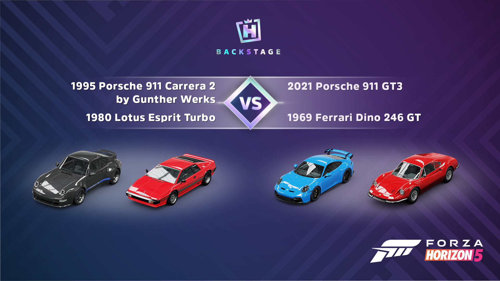 [p]Two super cars and retro rally all-stars encounter each other at the Horizon Backstage this week! You have until June 26 to vote for your favorite on/off road team and unlock the winning pair with Backstage Passes the following week! [/p][p][img src="https://clan.akamai.steamstatic.com/images/40722422/30daa99de201244657d29fefe5d6a043437b4180.png"][/p][p] Our first team brings one of Ferrari’s most iconic roadsters, the 2015 Ferrari California T. Don’t let the soft looks fool you! This car is equipped with a V8 engine that puts out 553 bhp. Its partner in dirt is the Group B menace, the 1986 Audi #2 Audi Sport quattro S1. [/p][p][img src="https://clan.akamai.steamstatic.com/images/40722422/1a8da046384f4f08b2847efd0458a8441c303406.jpg"][/p][p]The opposing team’s first member is the spiritual successor to the SLS AMG, the mighty 2015 Mercedes-AMG GT S. Making the GT S company is the car that took down the Quattro during the 1983 World Rally Championship, the 1982 Lancia 037 Stradale. [/p][p][/p][p][img src="https://clan.akamai.steamstatic.com/images/40722422/2c6a83b8ea3db0b1d84234240779411f00b02890.jpg"][/p][p]Make your choice today and unlock the winning pair next week! [/p]