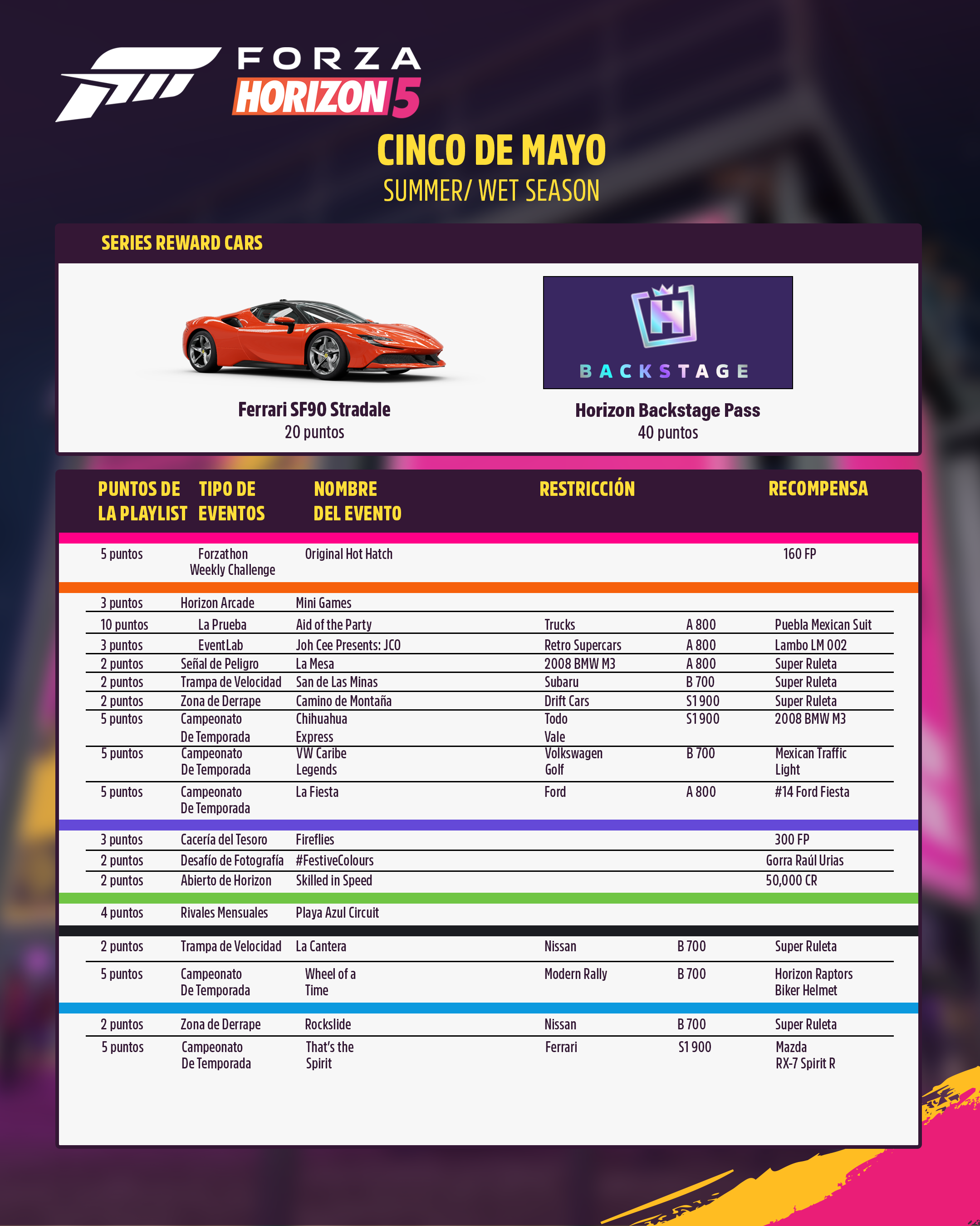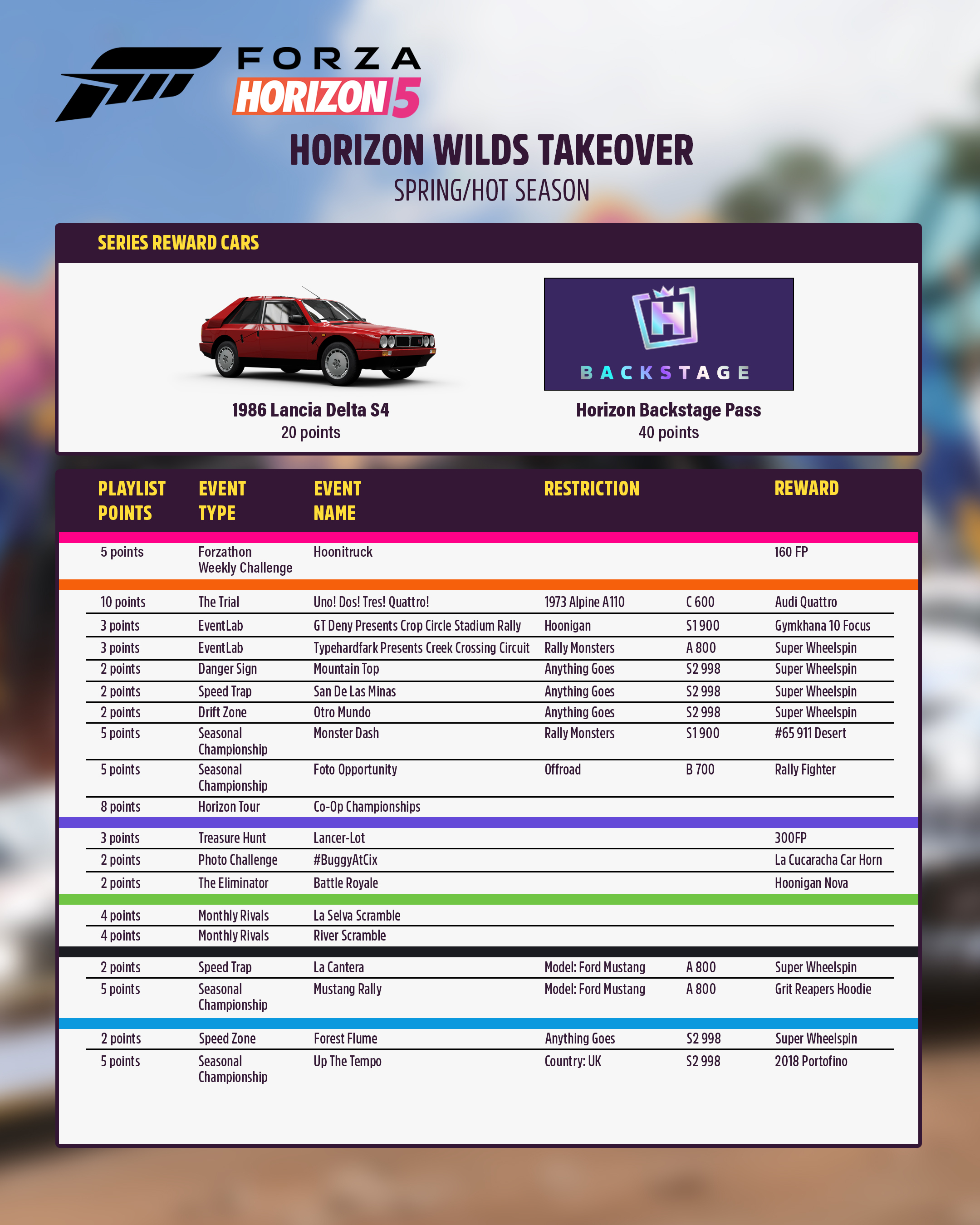 Your first option is Horizon Rush coming with rewards such as 1965 MINI Cooper S Forza Edition, 2017 Ford #14 Rahal Letterman Lanigan Racing GRC Fiesta, 2018 KTM X-Bow GT4, 2013 MINI X-Raid ALL4 Racing Countryman, 2010 Noble M600, 2018 Porsche Macan LPR Rally Raid.