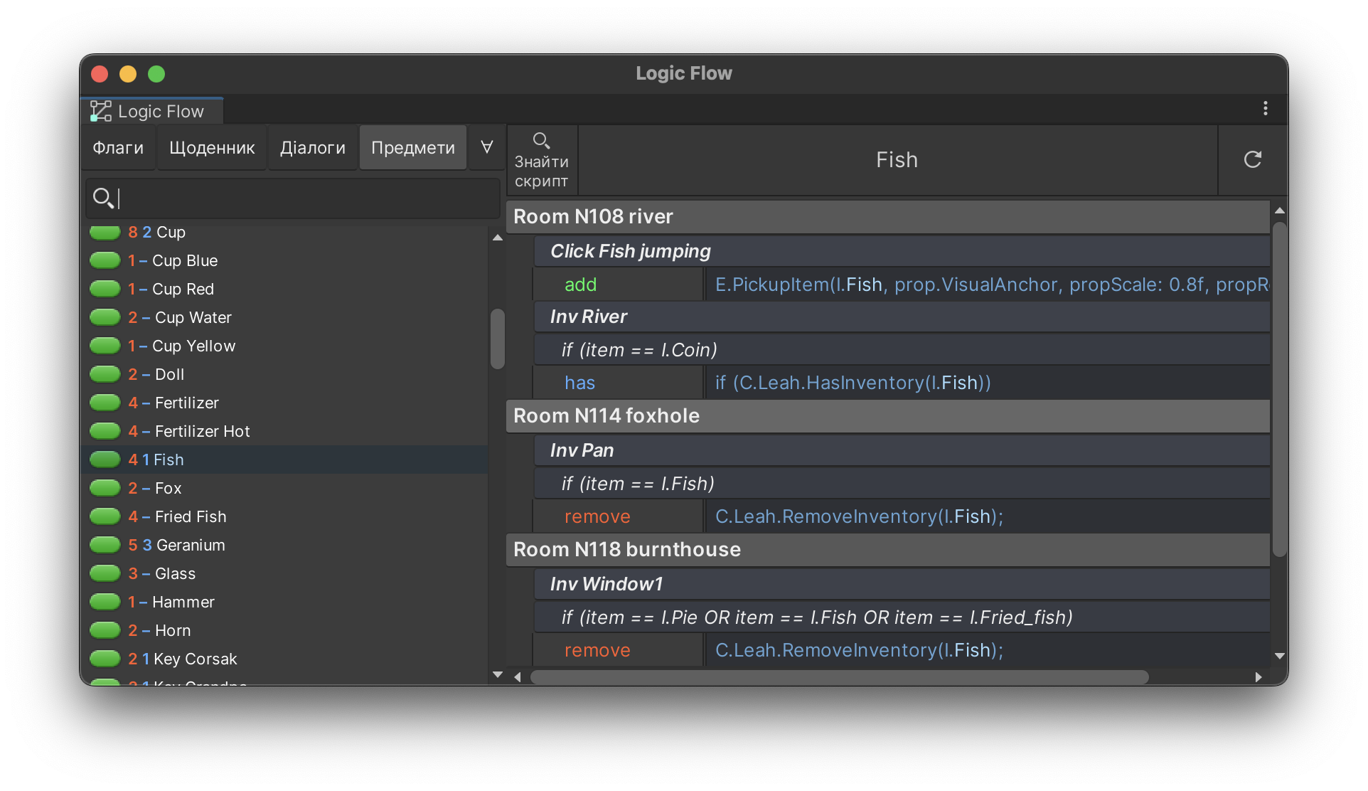 Take this Fish item on the screenshot. Here's what Logic Flow tells us: (vague puzzle spoilers if you haven't player Chapter 1)