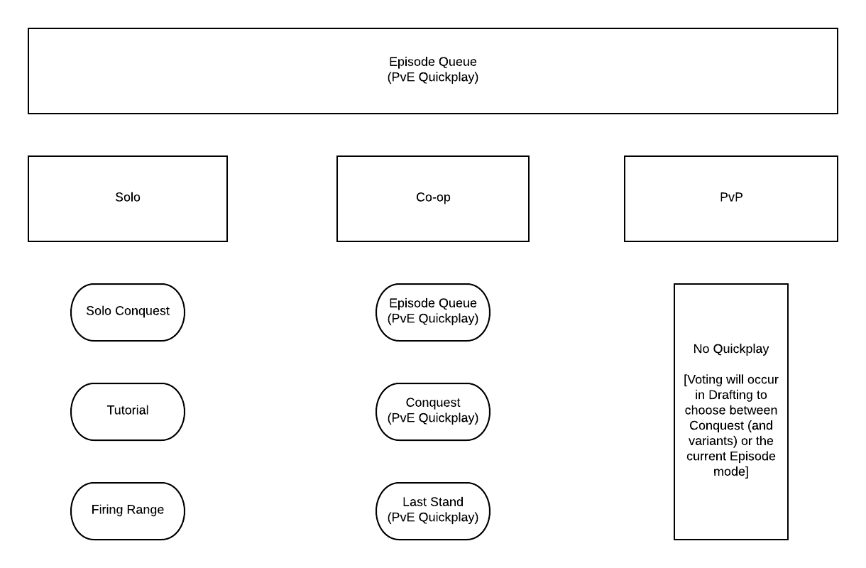In our next Episode Update, you can expect to find the Battle Mode selector to have some various functionality changes, while visually remaining quite similar. Quickplay will be returning to ensure players who wish to experience the new slice of Lore and episodic content we are providing can do so without waiting for an extended amount of time or allow any players who may be wishing to complete certain Campaigns or Missions the opportunity to do so in Co-op. Quickplay will not be a part of the PvP Queue