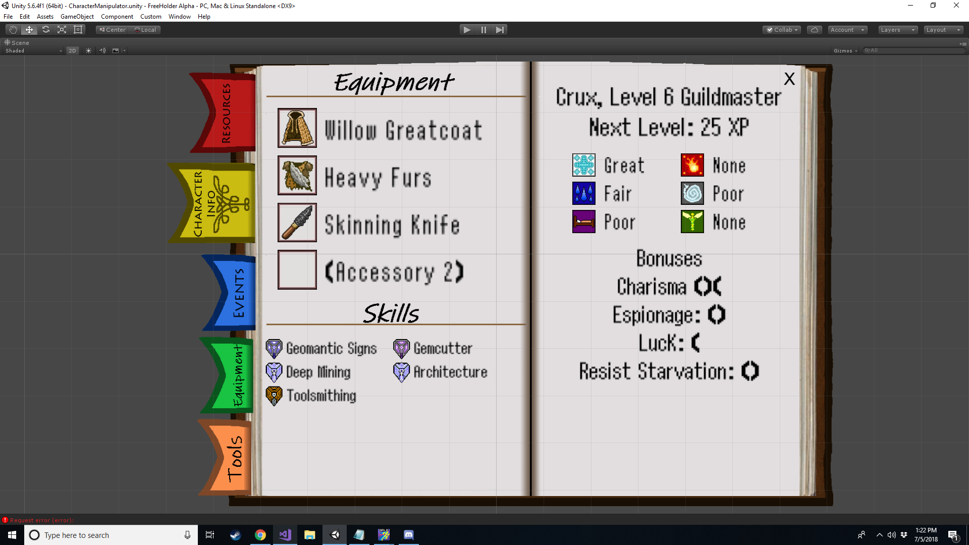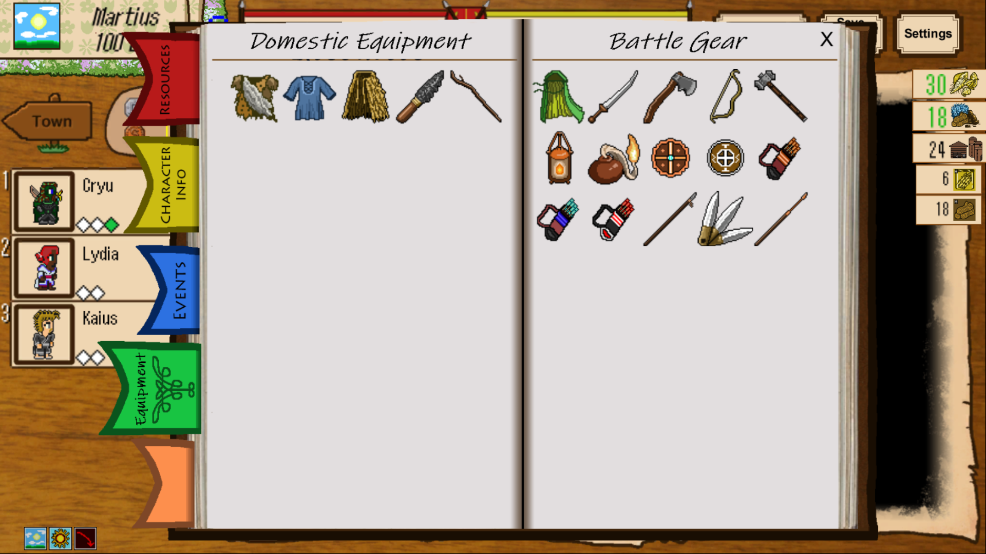 More Ledger Upgrades I want to get a tools page integrated into the ledger so that the player can check their tools status as easily as any other information, and also to redo the character equipment and status screen to fit an arbitrary amount of characters, 3 for now, at least 4 total planned for the future, and it could be more, although unlikely given the amount of art it would take. With the tools and battle equipment separated out, all that's left in terms of domestic equipment is cloaks, clothing, and two accessories. As long as these things remain tactically significant and do not become micro-managey, I intend to leave the remaining domestic equipment slots as they are. Once the ledger becomes an actually central source of information in the game, this will hopefully lessen the confusion regarding at least what the players actually have and what the things are for. One hopes.