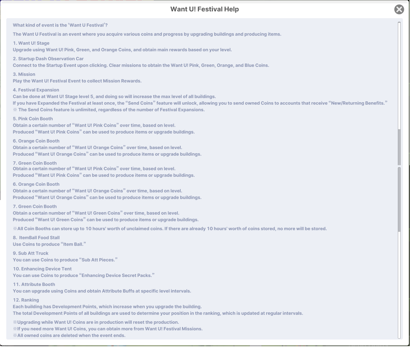 Reminder: Upgrades and item production cannot be cancelled once they start. When the event ends, all coins held will be deleted.