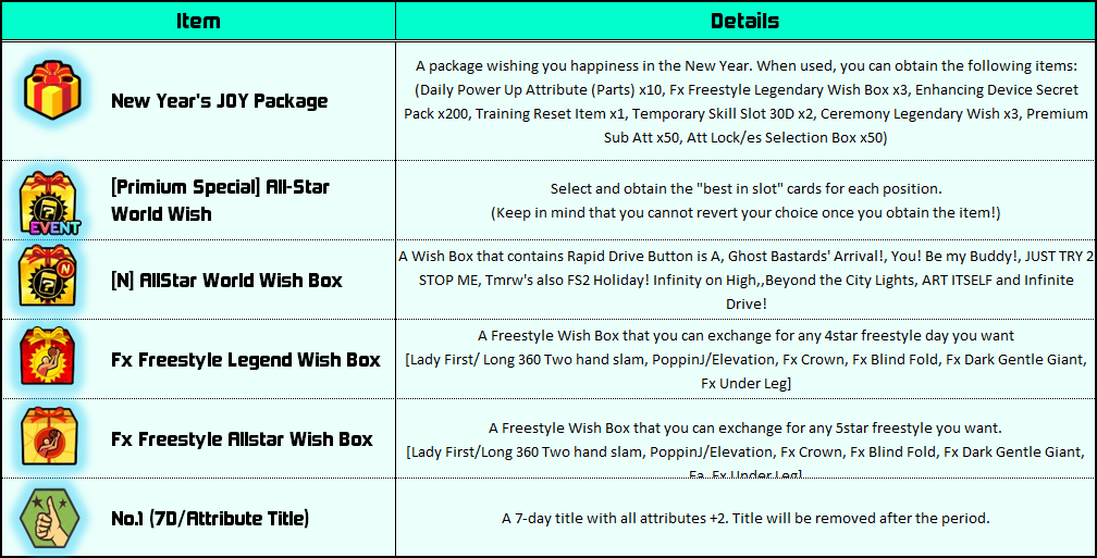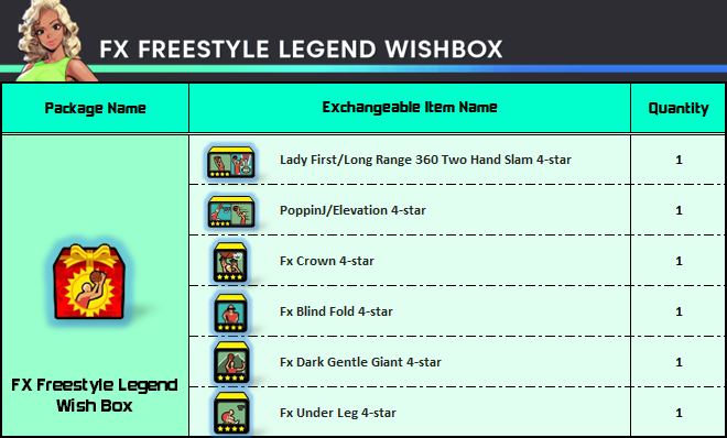 [table] [tr] [th]ㅤㅤㅤㅤ[color=yellow]System & Contents[/color][/th] [th]ㅤㅤㅤㅤ[color=yellow]Duration[/color][/th] [/tr] [tr] [td]Added 2 New Layup Effects in Freestyle (Fx Glow Shot, Fx Neon Pulse)[/td] [td]2024/12/18 00:00 (PST) ~[/td] [/tr] [/table]