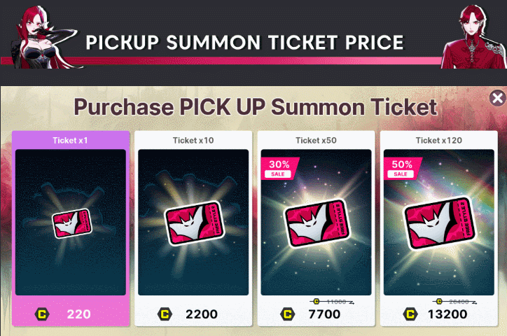 Note: [1] Purchased currency will all disappear after the event ends. [2] All obtained Mileage will disappear after the event ends. [3] Summon Tickets and Mileage are only displayed up to 9999, but you can own more than this amount. [4] Products on sale cannot be purchased with Event Cash.