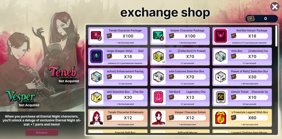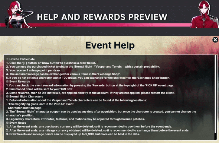 Purchasing: [1] Purchase 'Summon Tickets' by clicking the [+] or "Summon" buttons. [2] Eternal Night: Teneb and Vesper can be obtained at certain probabilities using the purchased tickets. [3] You can earn 1 Mileage Point per summon. [4] Obtained Mileage Points can be exhanged for various items in the "Exchange Shop". [5] If you haven't obtained the character in 100 summons, you can obtain her via the "Exchange Shop" button.