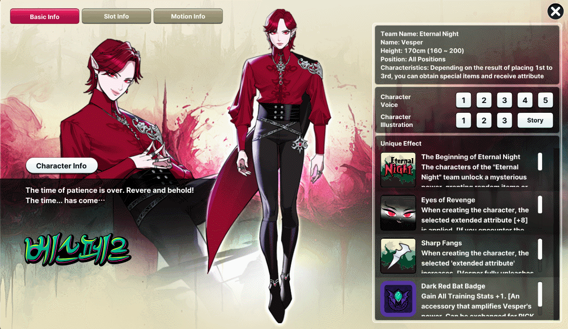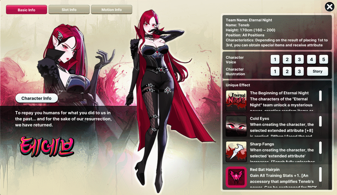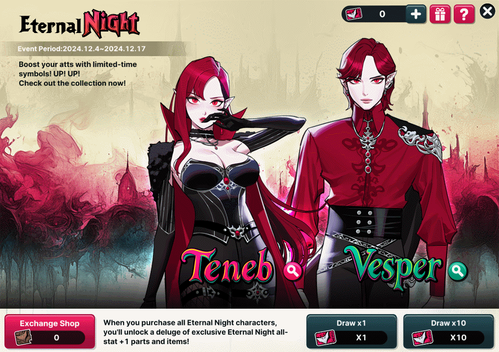 [1] You can view detailed information about Teneb and Vesper at the following pages. - "Character Info" at PICK UP Summon Event - Character Creation page [2] Teneb and Vesper Character Coupon can be used at any time after you obtain it, and you will not be able to change her position after creation. [3] Premium characters are subject to changes in their Attributes and functions due to balance patches. ======================================================================== Join us for the Eternal Night: Teneb and Vesper Draw Event and write your own legend on the court!