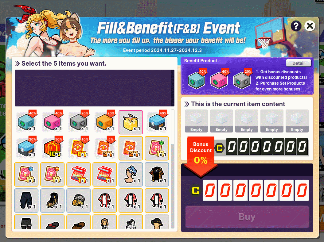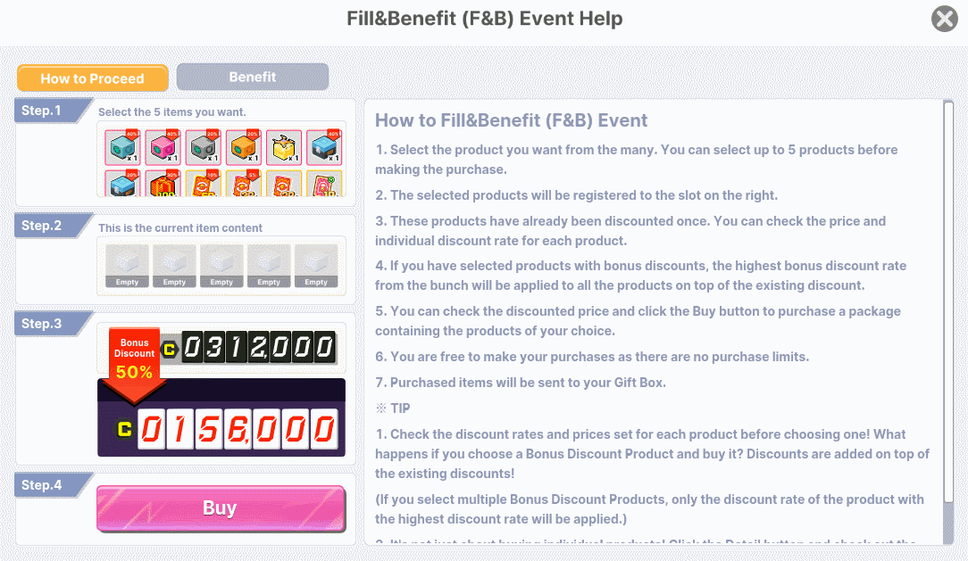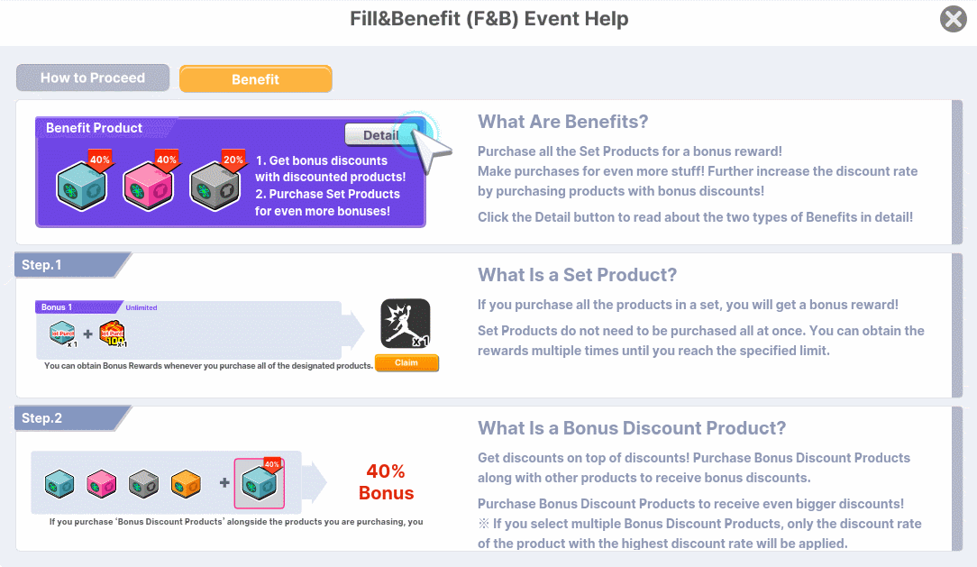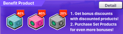 [color=orange]What Are Benefits?[/color] > Purchase all the Set Products for a bonus reward! Make purchases for even more stuff! Further increase the discount rate by purchasing products with bonus discounts! [color=gold]Click the Detail button to read about the two types of Benefits in detail![/color]