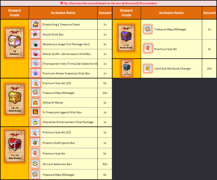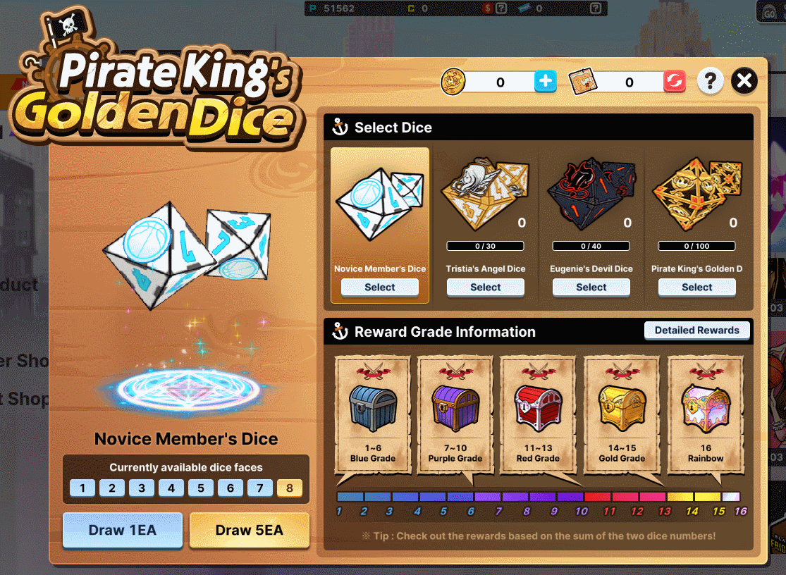 [color=gold]Note:[/color] > Pirate Coin can be used to purchase your dice of choice. > Once you accumulate enough rolls, you’ll unlock the chance to use [color=yellow]Tristia's Angel Dice, Eugenie's Devil Dice,[/color] and the [color=yellow]Pirate King's Golden Dice[/color] for even greater sums! > Keep an eye on the left side to see your selected dice and the possible numbers!
