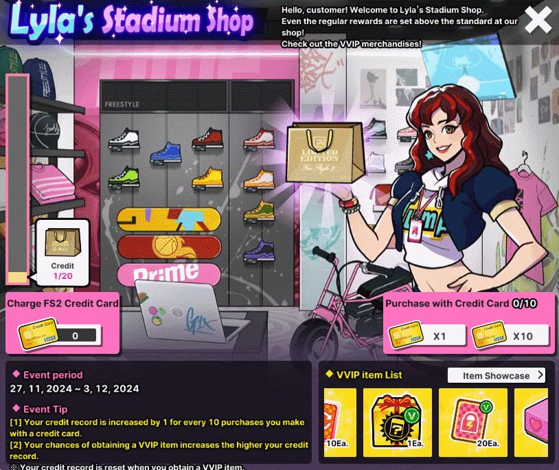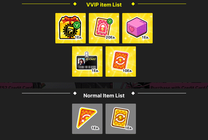 * Your credit score is increased by 1 for every 10 credit card purchases you make. * The higher your credit score, the higher chance of getting a VVIP Item. * Your credit score will reset once you obtain at least one VVIP Item.