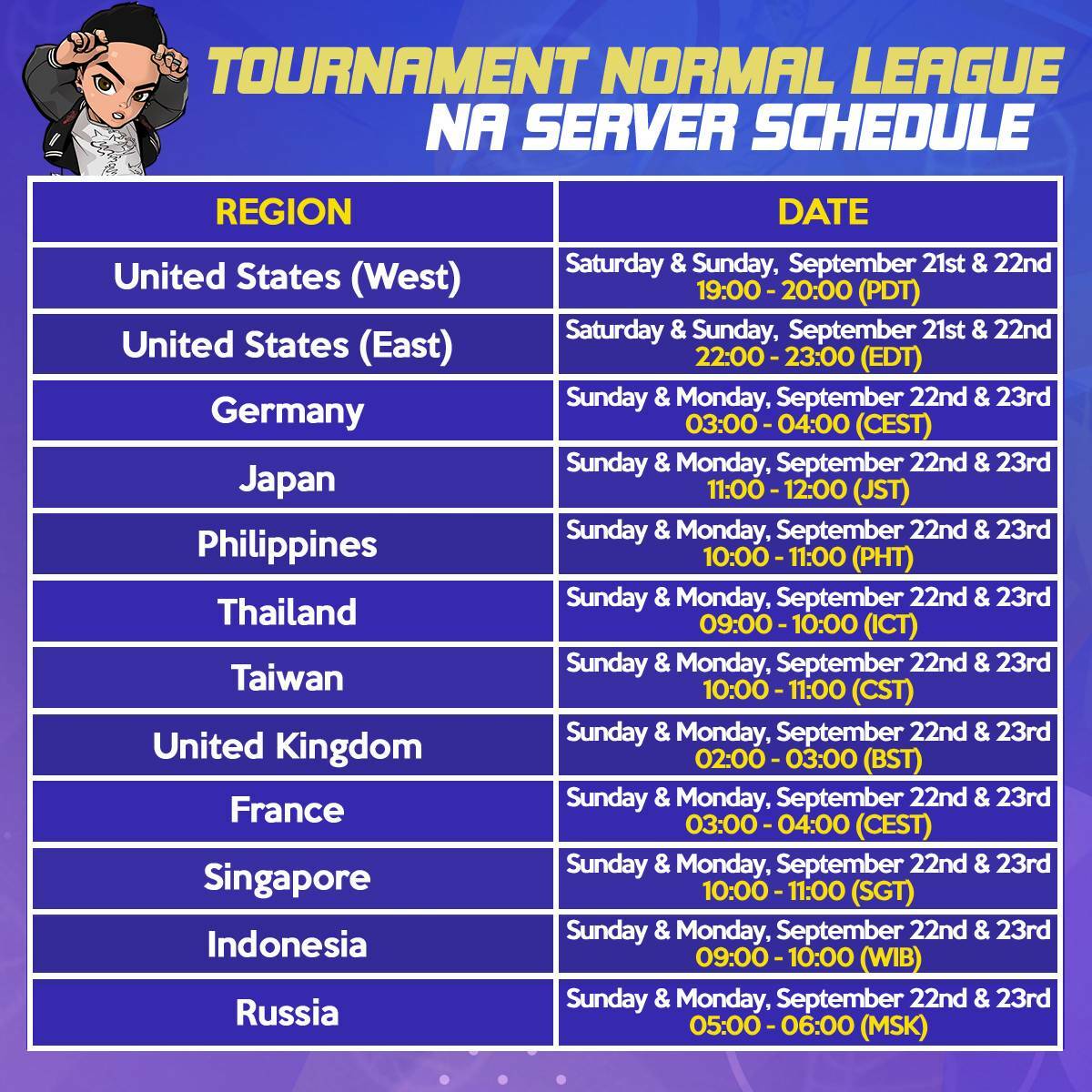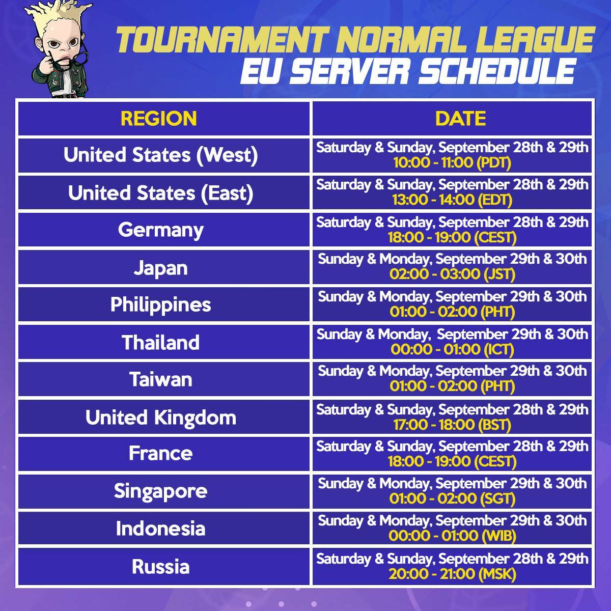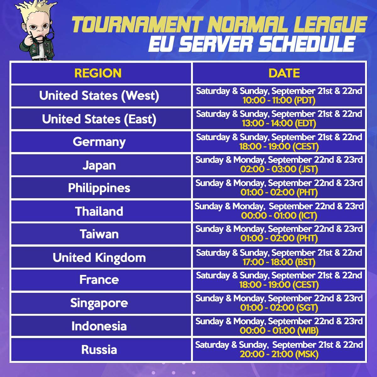 [table] [tr] [td]United States (West)[/td] [td]Wednesday, September 18th 23:00 ~ Thursday, September 19th 02:00 (PDT)[/td] [/tr] [tr] [td]United States (East)[/td] [td]Thursday September 19th 02:00 ~ 05:00 (EST)[/td] [/tr] [tr] [td]Germany[/td] [td]Thursday September 19th 08:00 ~ 11:00 (CET)[/td] [/tr] [tr] [td]Russia[/td] [td]Thursday September 19th 09:00 ~ 12:00 (MSK)[/td] [/tr] [tr] [td]Japan[/td] [td]Thursday September 19th 14:00 ~ 17:00 (JST)[/td] [/tr] [tr] [td]Philippines[/td] [td]Thursday September 19th 14:00 ~ 17:00 (PHT)[/td] [/tr] [tr] [td]Thailand[/td] [td]Thursday September 19th 13:00 ~ 16:00 (ICT)[/td] [/tr] [/table]