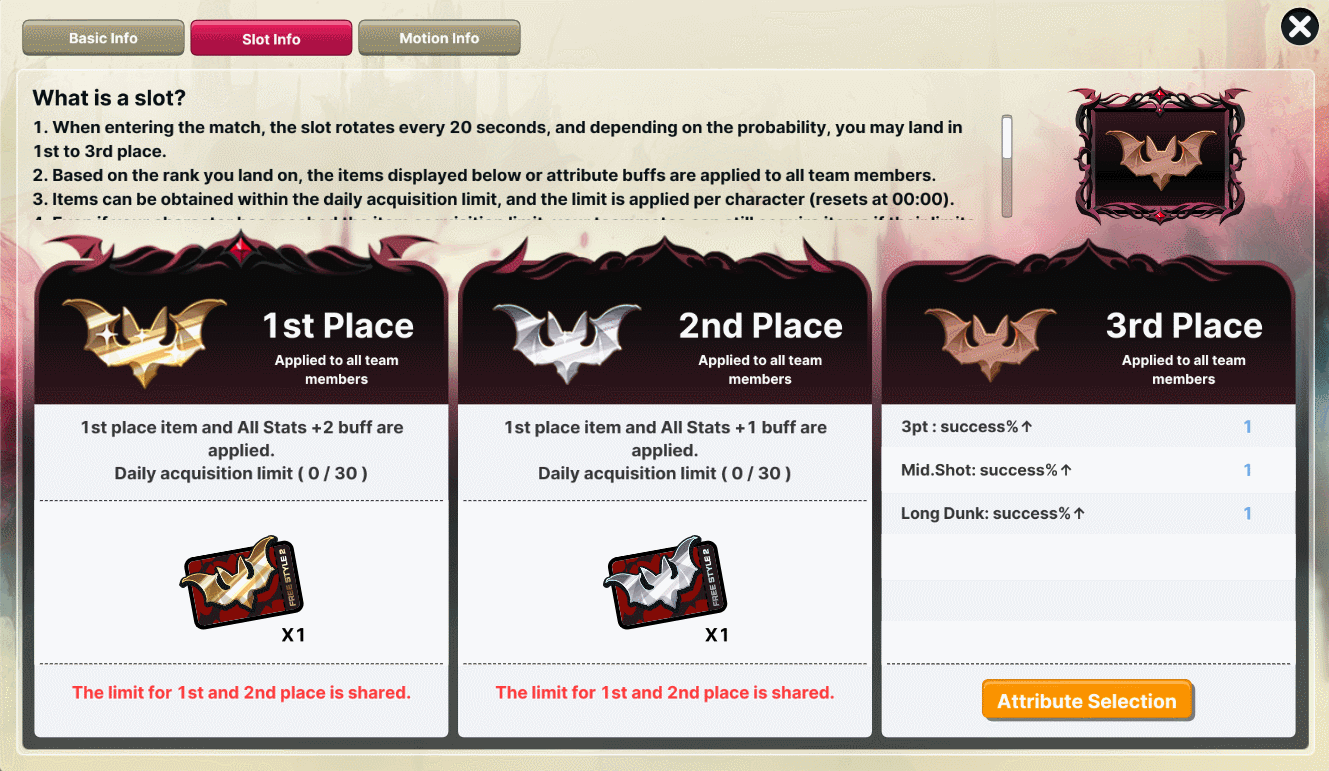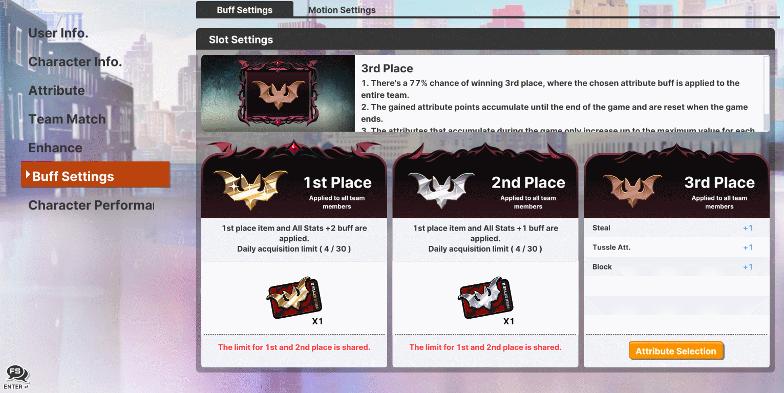 - This character features a roulette buff that allows you to gain items or stat buffs based on the results of the in-game roulette during the match. Note: Applied buffs will be maintained until reset and reapplied due to offensive and defensive transitions. - At the start of the game, the slot results determine the 1st to 3rd place outcomes. Depending on the result, you can obtain items, team buffs, or personal buffs. - User can select a maximum of 1 item and up to 3 stat buffs. Note: How to Set Buffs: Go to in-game user info > Buff Settings > Function Settings tab to configure it.