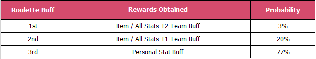 2) Rewards by Rank in the Roulette Buff - The functions applied vary depending on the rank from 1st to 3rd, and except for personal buffs, they are applied to the entire team. - There is no limit on the number of buffs that can be applied during the match. Note: In the case of stat increase buffs, the stats will only increase up to the maximum limit.