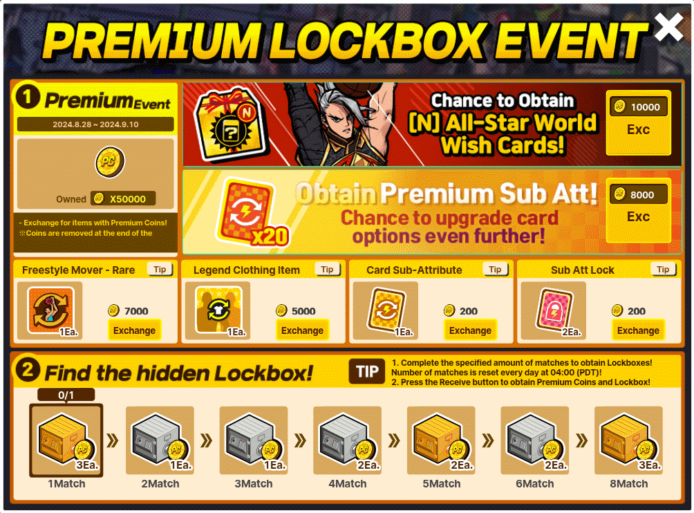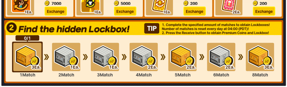 i. Complete the specified number of matches to obtain Lockboxes! The match count resets every day at 04:00 (PDT). ii. Press the Receive button to collect your Premium Coins and Lockbox!