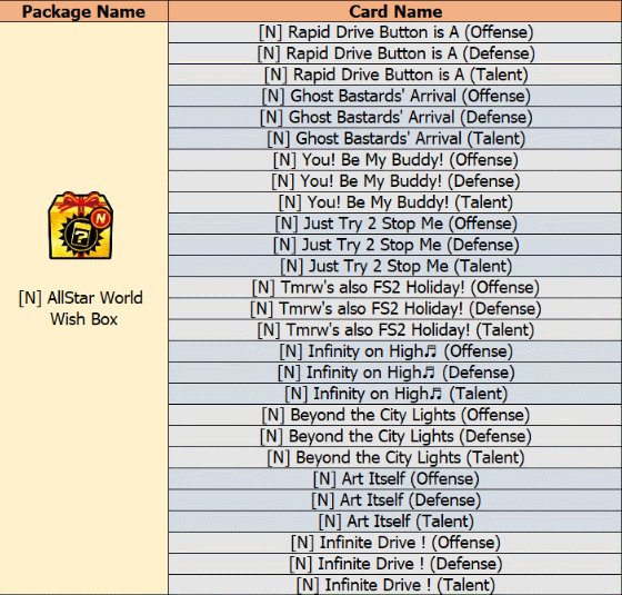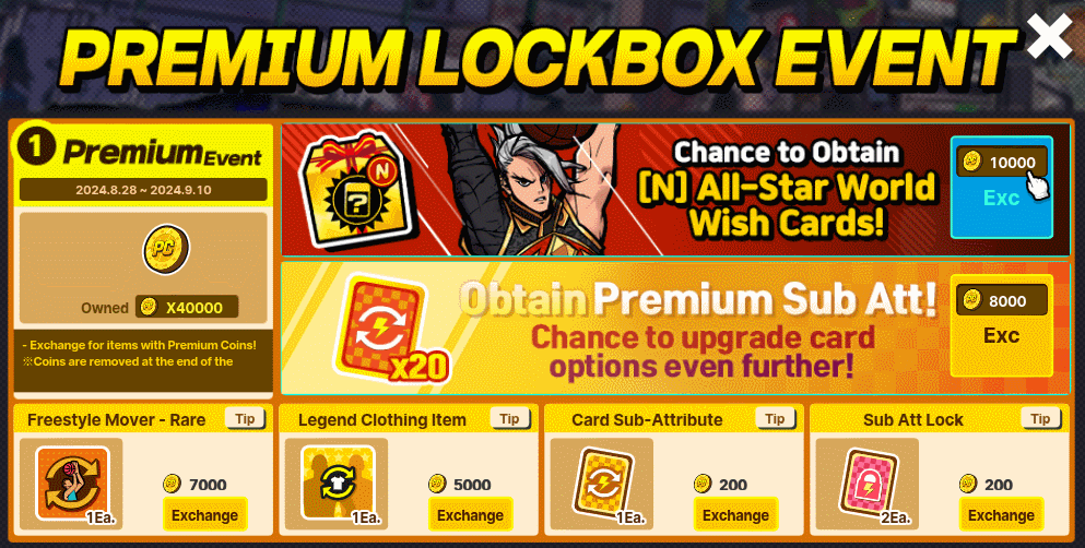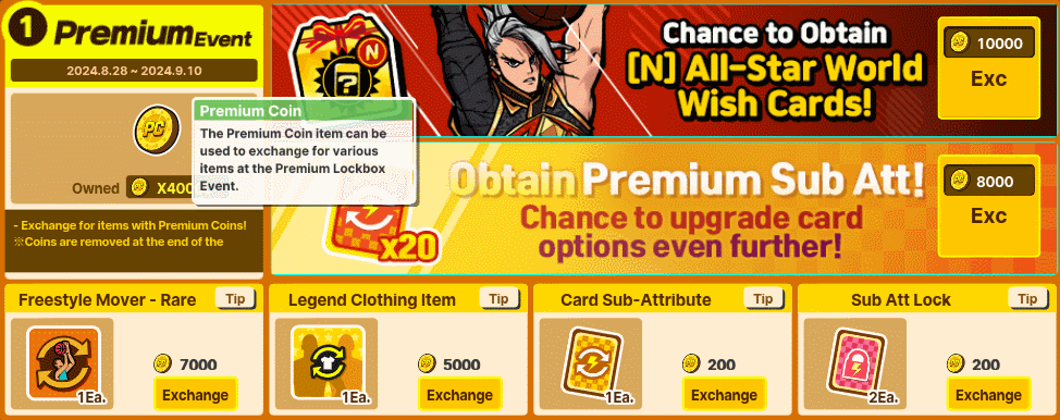 → Exchange for items with Premium Coins! ~ Coins are removed at the end of the event. → A chance to obtain [N] All-Star World Wish Cards and Premium Sub Att! → Upgrade your card options even further!