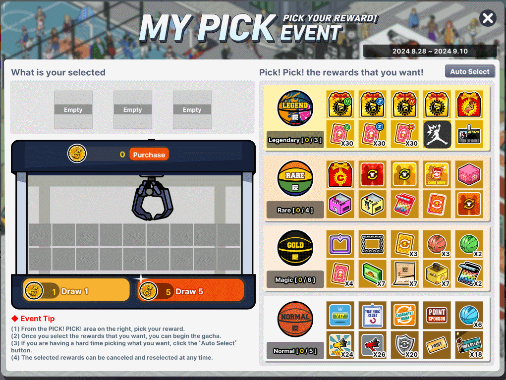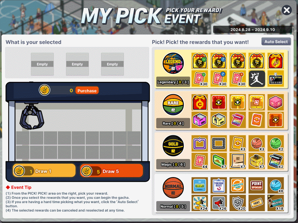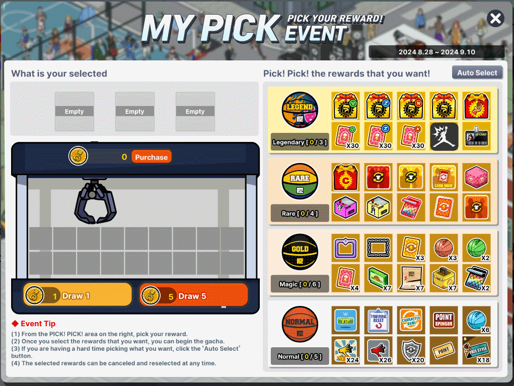 1. From the "PICK! PICK!" on the right, pick your rewards. 2. Once you have selected the rewards you want, you can begin the gacha. 3. If you are having a hard time deciding what you want, click "Auto Select". 4. The selected rewards can be canceled and re-selected at any time. 5. The obtained items will be sent to your gift box.